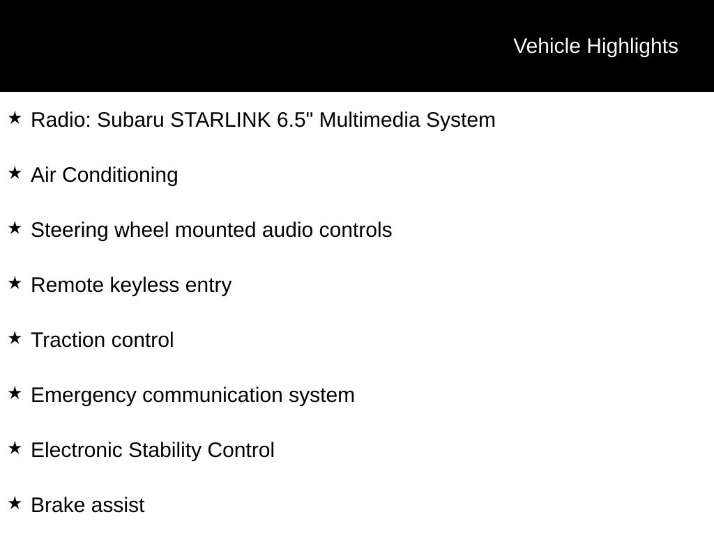 This Impreza's sleek black exterior and well-appointed interior create a sophisticated and modern aesthetic. Enjoy the convenience of features like the remote keyless entry, steering wheel-mounted audio controls, and the STARLINK infotainment system with seamless smartphone integration. Stay connected and in control with the emergency communication system and speed control, while the traction control and electronic stability control provide added peace of mind.