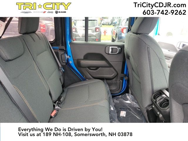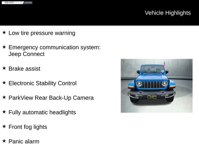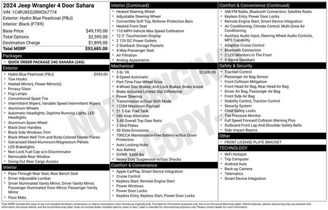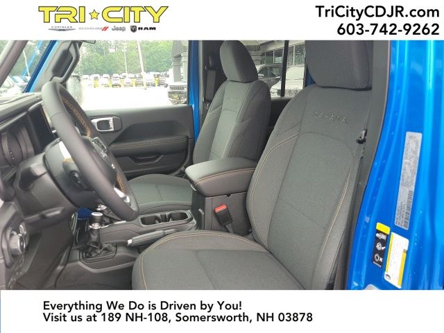 2024 Jeep Wrangler Sahara Hydro Blue Pearl Coat 12.3" Touchscreen Display, 3.45 Overall Top Gear Ratio, 8 Speakers, Air Conditioning, AM/FM radio: SiriusXM, Apple CarPlay, Apple CarPlay/Android Auto, Automatic temperature control, Aux Battery, Brake assist, Cloth Low-Back Bucket Seats, Electronic Stability Control, Emergency communication system: Jeep Connect, Front Center Armrest w/Storage, Front dual zone A/C, Front fog lights, Fully automatic headlights, Google Android Auto, Heated door mirrors, Heated front seats, Heated steering wheel, Heavy Duty Suspension w/ FOX Gas Shocks, Integrated Center Stack Radio, Integrated Voice Command w/Bluetooth, Low tire pressure warning, Outside temperature display, Panic alarm, ParkView Rear Back-Up Camera, Passenger vanity mirror, Power door mirrors, Radio data system, Radio: Uconnect 5 w/12.3" Display, Rear reading lights, Rear Window Defroster, Remote keyless entry, Security system, Speed control, Steering wheel mounted audio controls, Stop-Start Dual Battery System, Tachometer, Telescoping steering wheel, Tilt steering wheel, Traction control, Trip computer, Voltmeter, Wheels: 18" x 7.5" Machine/Painted Gray. Clean CARFAX.