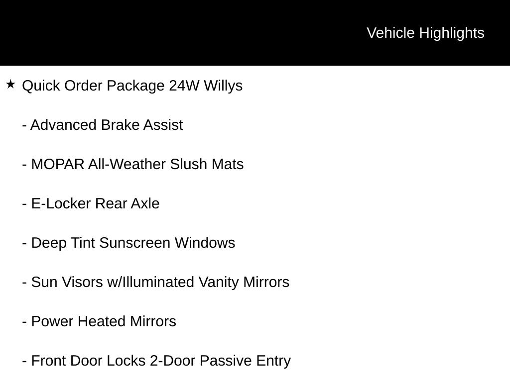 Granite Crystal Metallic Clearcoat 2025 Jeep Gladiator Willys 8-Speed Automatic 4-Wheel Drive Decal, 97 MPH Vehicle Max Speed Calibration, Advanced Brake Assist, Air Conditioning w/Auto Temperature Control, Automatic Headlamps, Auxiliary Switches, Black Grille, Body Color Fender Flares (2-Piece), Class IV Receiver Hitch, Cluster 7.0" TFT Color Display, Convenience Group, Corning Gorilla Glass, Daytime Running Lamp System, Daytime Running Lamps LED Accents, Deep Tint Sunscreen Windows, E-Locker Rear Axle, Emergency/Assistance Call, Enhanced Adaptive Cruise Control, Front Door Locks 2-Door Passive Entry, Front fog lights, Front Heavy Duty Red Accent Shock Absorbers, Front LED Fog Lamps, Full Speed Forward Collision Warning Plus, Heated Front Seats, Heated Steering Wheel, Heavy-Duty Engine Cooling, LED Premium Reflector Headlamps, LED Taillamps, Mold In Color Bumper w/Gloss Black, MOPAR All-Weather Slush Mats, Off-Road Plus Mode, ParkView Rear Back-Up Camera, Power Heated Mirrors, Premium Wrapped Steering Wheel, Protection Sill Rails, Quick Order Package 24W Willys, Radio: Uconnect 5 w/12.3" Display, Rear Heavy Duty Red Accent Shock Absorbers, Remote Start System, Security Alarm, Sun Visors w/Illuminated Vanity Mirrors, Trailer Hitch Zoom, Universal Garage Door Opener, Wheels: 17" x 7.5" Painted Black, Willys Hood Decal, Willys Suspension. Price includes: $2250 - 2025 National Retail Bonus Cash . Exp. 02/02/2026