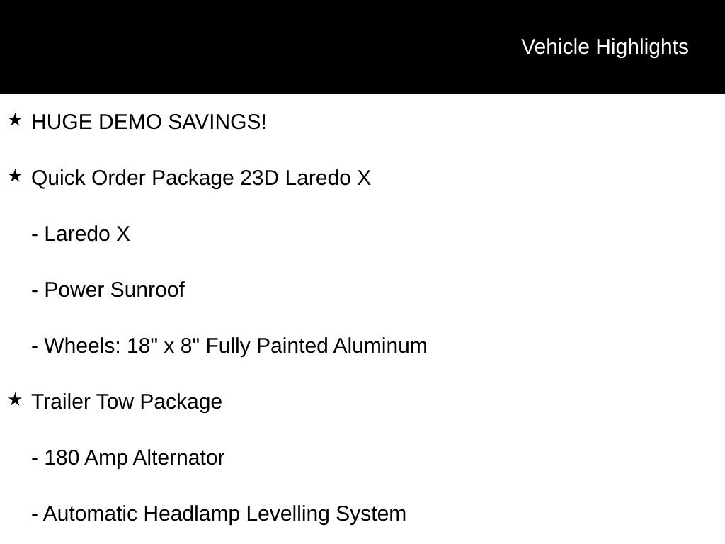 Bright White Clearcoat 2025 Jeep Grand Cherokee Laredo 8-Speed Automatic HUGE DEMO SAVINGS!, 4WD, 115V Auxiliary Power Outlet, 180 Amp Alternator, 7 & 4-Pin Wiring Harness, Automatic Headlamp Levelling System, Class IV Receiver Hitch, Heated Front Seats, Heated Steering Wheel, Heavy-Duty Engine Cooling, Laredo X, Luxury Tech Group I, Overhead airbag, Power Liftgate, Power Sunroof, Quick Order Package 23D Laredo X, Radio: Uconnect 5 w/8.4" Display, Rain Sensitive Windshield Wipers, Rear Load Levelling Suspension, Remote keyless entry, Remote Start System, Secondary Active Grille Shutters, Selectable Tire Fill Alert, Steering wheel mounted audio controls, Traction control, Trailer Hitch Zoom, Trailer Tow Package, Wheels: 18" x 8" Fully Painted Aluminum, Wireless Charging Pad. 19/26 City/Highway MPG Price includes: $1500 - 2025 Northeast BC Select Inventory Bonus Cash. Exp. 11/03/2025 $1750 - 2025 National Retail Bonus Cash . Exp. 11/03/2025 $500 - 2025 National Jeep Monopoly Money Bonus Cash . Exp. 11/03/2025