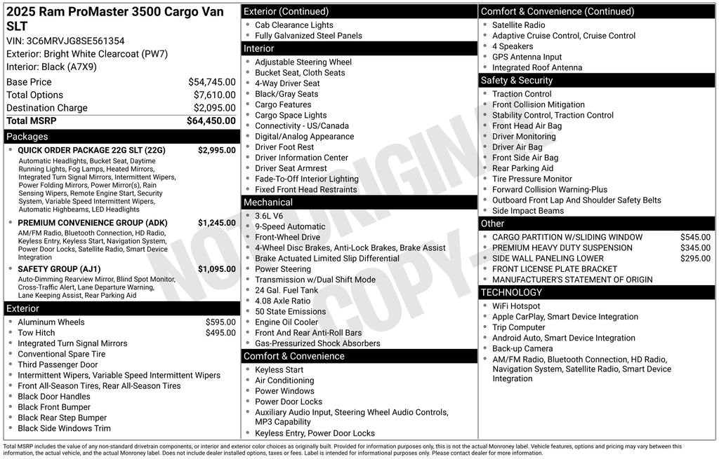 Bright White Clearcoat 2025 Ram ProMaster 3500 High Roof 9-Speed 948TE Automatic 10.1" Touchscreen Display, 100 Amp Battery, 115V Auxiliary Power Outlet, 12V Rear Auxiliary Power Outlet, 220 Amp Alternator, 4-Way Manual Adjust Front Passenger Seat, 4G LTE Wi-Fi Hotspot, Adaptive Cruise Control w/Stop & Go, Ambient LED Interior Lighting, Apple CarPlay, Auto High Beam Headlamp Control, Automatic Headlamps, Blind Spot & Cross Path Detection, Chrome Front Grille, Cluster 7.0" TFT Color Display, Connected Travel & Traffic Services, Connectivity - US/Canada, Cowl Aesthetic Cover, Digital Rearview Mirror w/Autodim, Disassociated Touchscreen Display, Exterior Mirrors w/Heating Element, Exterior Mirrors w/Supplemental Signals, For Details, Visit DriveUconnect.com, For More Info, Call 800-643-2112, Front LED Fog Lamps, Global Telematics Box Module (TBM), Google Android Auto, GPS Antenna Input, GPS Navigation, HD Radio, Heavy Duty Suspension, Instrument Panel Bright Bezels, Integrated Center Stack Radio, Integrated Voice Command w/Bluetooth, Intelligent Speed Assist (ISA), Lane Departure Warning Plus, LED Daytime Running Headlamps, LED Reflector Headlamps, ParkSense Front/Rear Park Assist System, ParkSense Rear Park Assist System, Passenger Bucket Seat, Passive Entry, Power Adjust Mirrors, Power Folding/Heated Mirrors, Power-Adjustable Convex Aux Mirrors, Premium Convenience Group, Quick Order Package 22G SLT, Radio: Uconnect 5 Nav w/10.1" Display, Rain Sensitive Windshield Wipers, Rear Cargo LED Lamp, Rear Heater - A/C Prep Package, Remote Start System, Safety Group, Security Alarm, Side Wall Paneling Lower, SiriusXM Radio Service, SiriusXM w/360L, Traction control, Traffic Sign Information, Wheels: 16" x 6.0" Aluminum Painted Silver, Wireless Charging Pad. Price includes: $5000 - 2025 National Bonus Cash . Exp. 03/31/2026