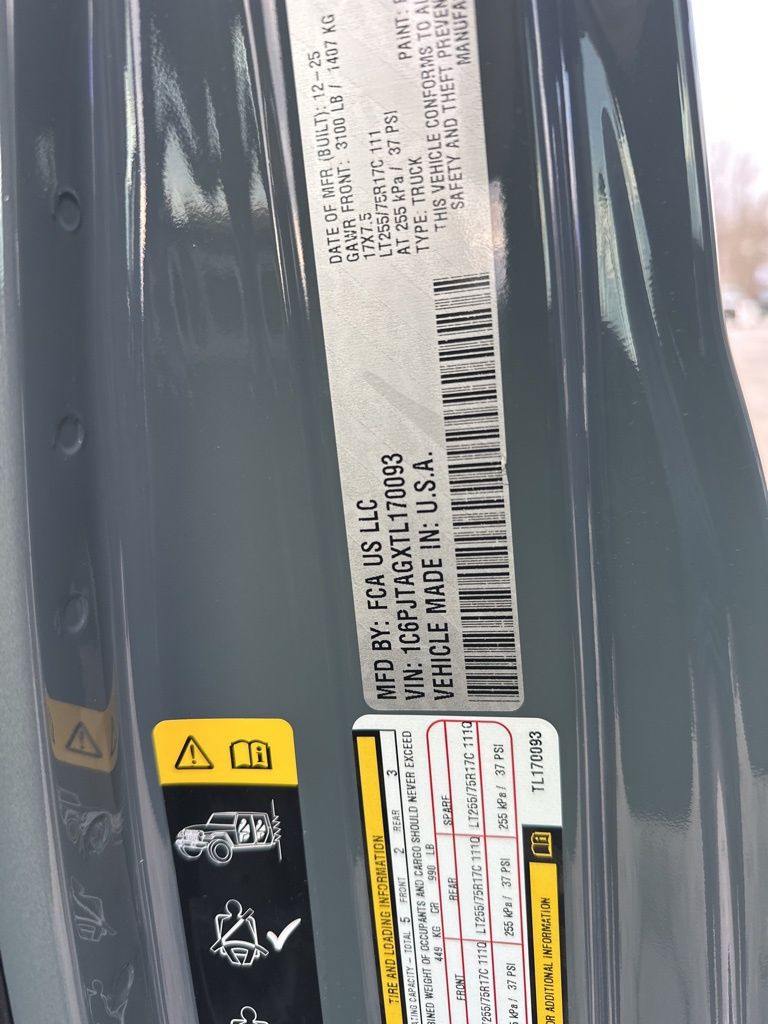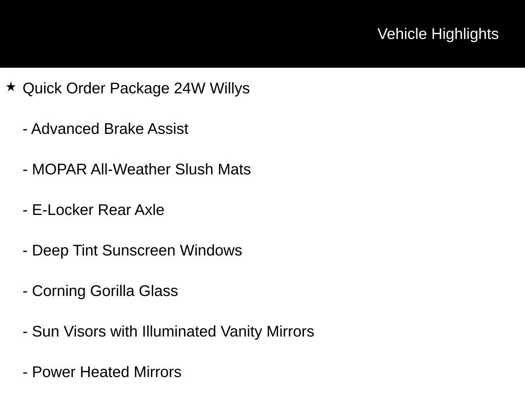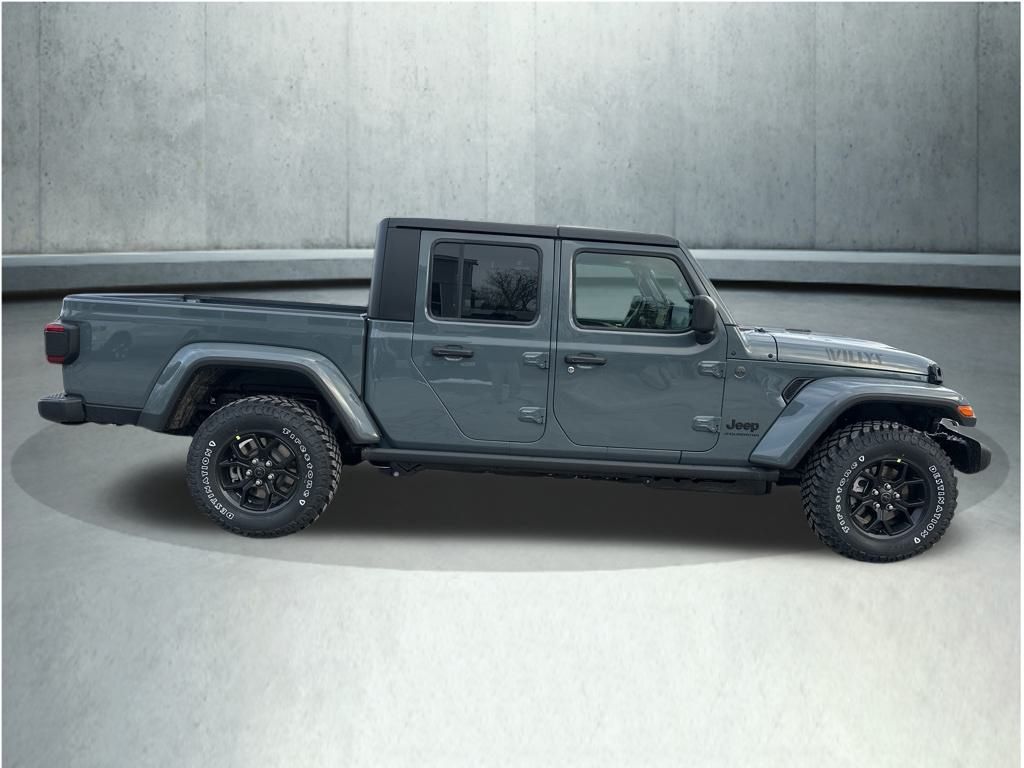 anvil clearcoat 2026 Jeep Gladiator Willys 8-Speed Automatic 2-Piece Body Color Fender Flares, 4-Wheel Drive Decal, Advanced Brake Assist, Air Conditioning with Auto Temp Control, Apple CarPlay/Android Auto, Auto High Beam Headlamp Control, Automatic Headlamps, Auxiliary Switches, Black Grille with Gloss Black Rings, Blind Spot and Cross Path Detection, Class IV Receiver Hitch, Cluster 7.0" TFT Color Display, Convenience Group, Corning Gorilla Glass, Daytime Running Lamp System, Daytime Running Lamps LED Accents, Deep Tint Sunscreen Windows, E-Locker Rear Axle, Electronic Stability Control, Emergency/Assistance Call, Front Door Locks 2-Door Passive Entry, Front Heavy Duty Red Accent Shock Absorbers, Front LED Fog Lamps, Full Speed Forward Collision Warning Plus, Heated Front Seats, Heated Steering Wheel, Heavy-Duty Engine Cooling, LED Premium Reflector Headlamps, LED Taillamps, Mold in Color Bumper with Gloss Black, MOPAR All-Weather Slush Mats, Off-Road Plus Mode, ParkSense Rear Park Assist System, ParkView Rear Back-Up Camera, Power Heated Mirrors, Premium Wrapped Steering Wheel, Protection Sill Rails, Quick Order Package 24W Willys, Radio: Uconnect 5 with 12.3" Display, Rear Heavy Duty Red Accent Shock Absorbers, Rear Sliding Window, Remote Start System, Safety Group, Security Alarm, Speed control, Sun Visors with Illuminated Vanity Mirrors, Trailer Hitch Zoom, Universal Garage Door Opener, Wheels: 17" x 7.5" Painted Black, Willys Hood Decal, Willys Suspension.