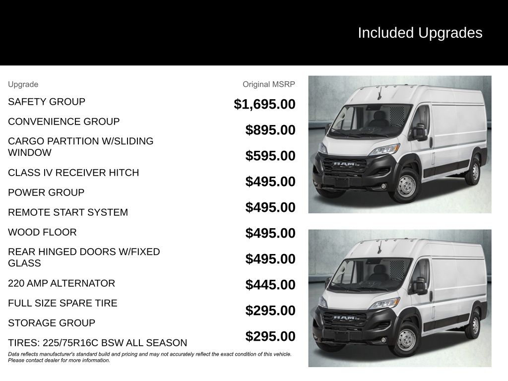 Bright White Clearcoat 2026 Ram ProMaster 2500 High Roof 9-Speed Automatic 100 Amp Battery, 115V Auxiliary Power Outlet, 12V Rear Auxiliary Power Outlet, Blind Spot and Cross Path Detection, Cargo Net, Class IV Receiver Hitch, Convenience Group, Digital Rearview Mirror with Autodim, Electronic Stability Control, Exterior Mirrors with Heating Element, Exterior Mirrors with Supplemental Signals, Front Fog Lamps, Heavy Duty Suspension, Intelligent Speed Assist (ISA), Lane Departure Warning Plus, Overhead airbag, ParkSense Front/Rear Park Assist System, ParkView Rear Back-Up Camera, Power Adjust Mirrors, Power Folding/Heated Mirrors, Power Group, Power-Adjustable Convex Aux Mirrors, Power-Folding Mirrors, Radio: Uconnect 5 with 7" Display, Rear Cargo LED Lamp, Rear Window Defroster, Remote keyless entry, Safety Group, Shelf Above Roof Trim, Steering wheel mounted audio controls, Storage Group, Traction control, Underseat Storage Tray. Price includes: $4000 - 2026 National Bonus Cash . Exp. 03/31/2026