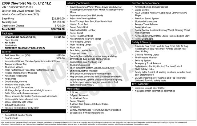 Introducing the 2009 Chevrolet Malibu LTZ - a sophisticated and well-equipped sedan that offers an exceptional driving experience. With its sleek red exterior and powerful 3.6L V6 engine, this Malibu LTZ is a true standout in its class.