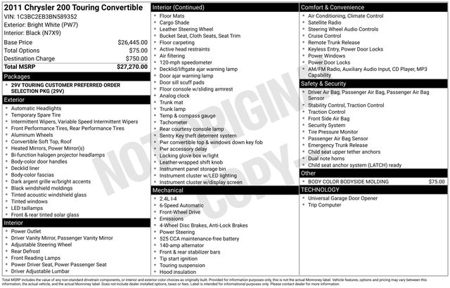 Under the hood, the 2011 Chrysler 200 Touring is powered by a robust 2.4L I4 DOHC 16V Dual VVT engine, paired with a smooth-shifting 6-Speed Automatic transmission and Front-Wheel Drive. This dynamic powertrain delivers an impressive balance of fuel efficiency and responsive performance, allowing you to enjoy the drive with confidence.