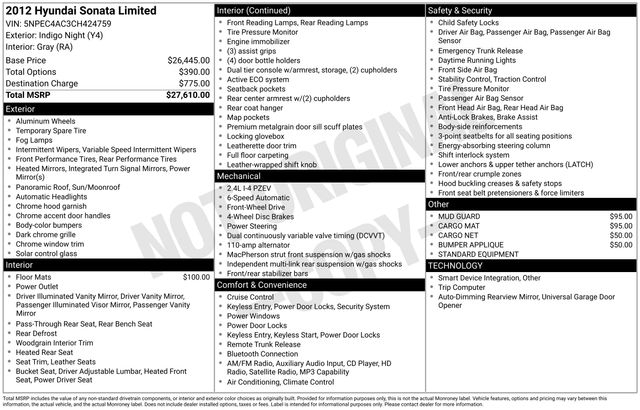 Elevate your driving experience with this exceptional 2012 Hyundai Sonata Limited. Boasting a sleek and sophisticated exterior in a captivating Blue hue, this vehicle is a true head-turner. Powered by a 2.4L 4-Cylinder DGI PZEV engine and a 6-Speed Automatic with Shiftronic transmission, the Sonata Limited delivers a remarkable blend of performance and efficiency, with an impressive 24 city/35 highway MPG.