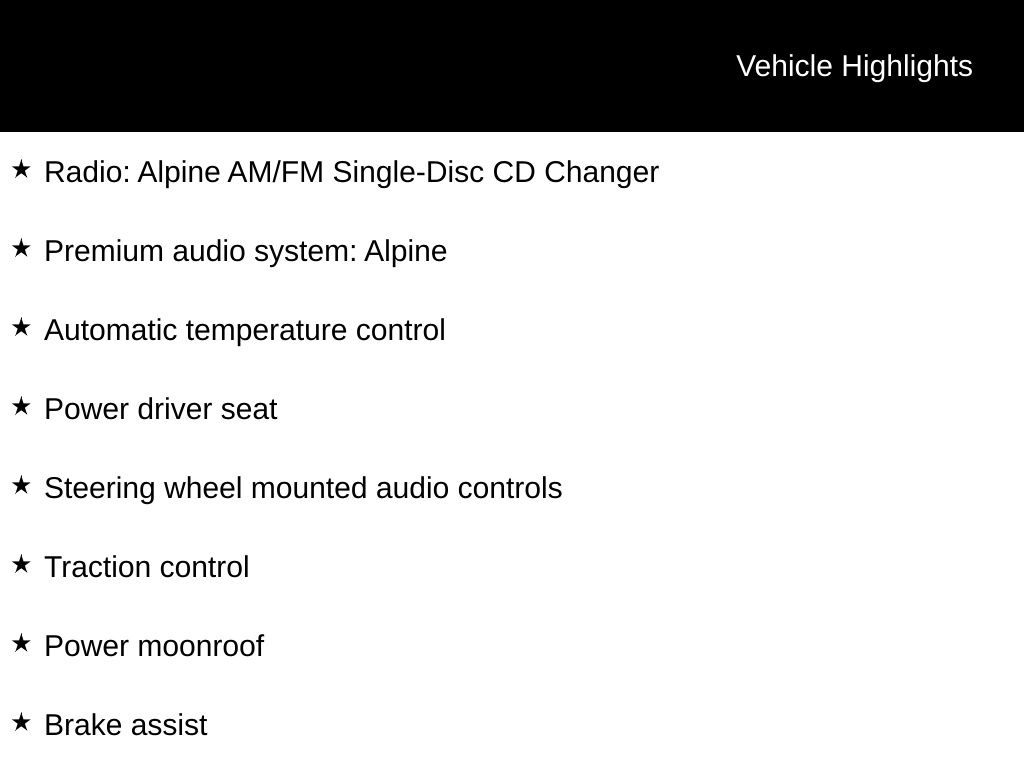 - Radio: Alpine AM/FM Single-Disc CD Changer