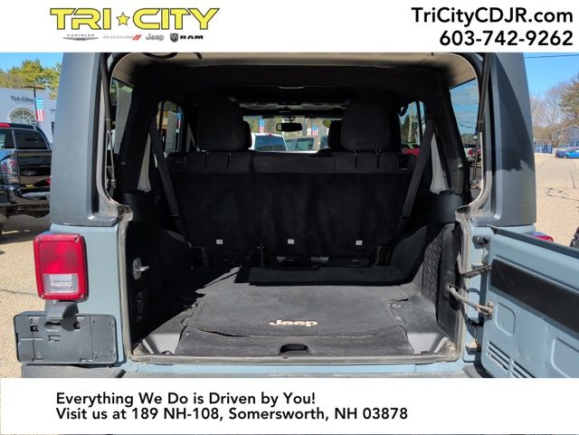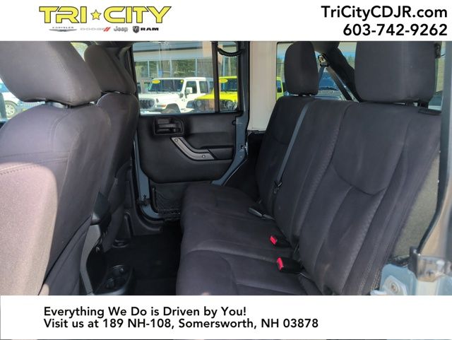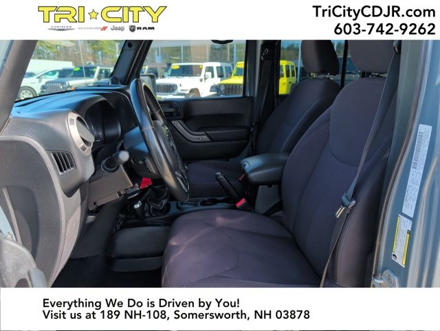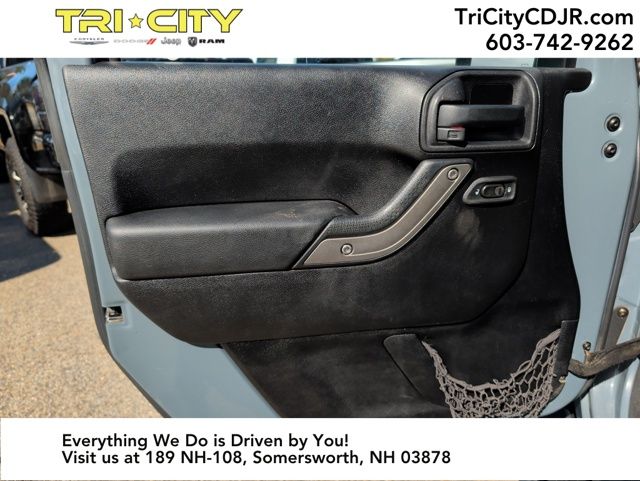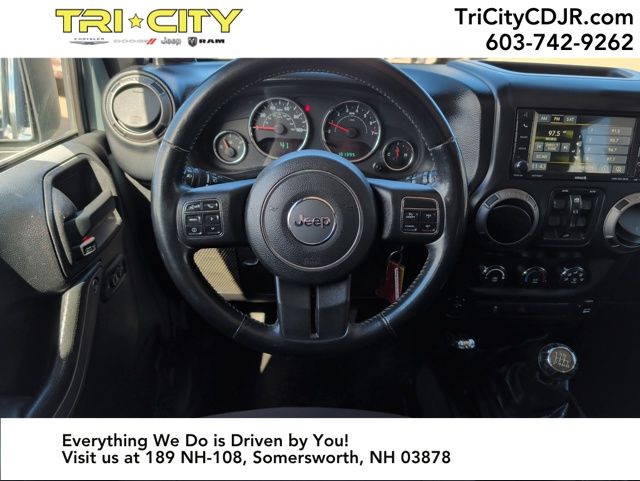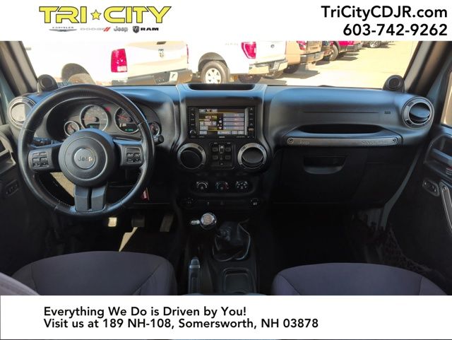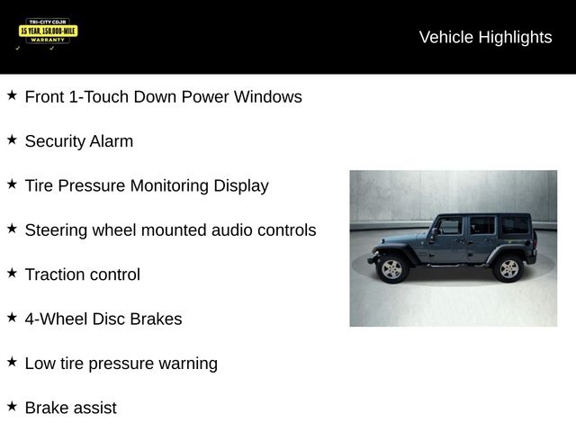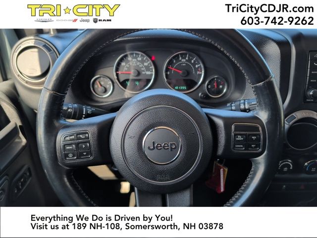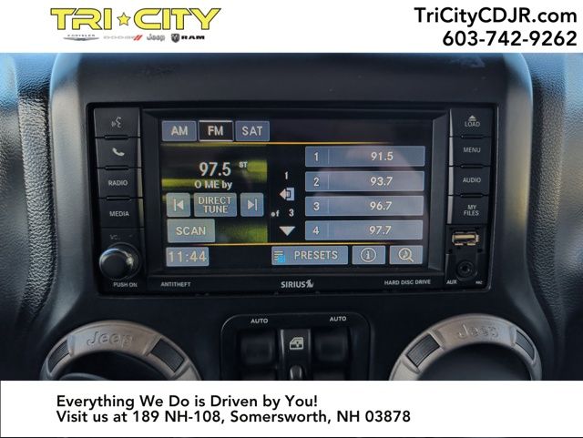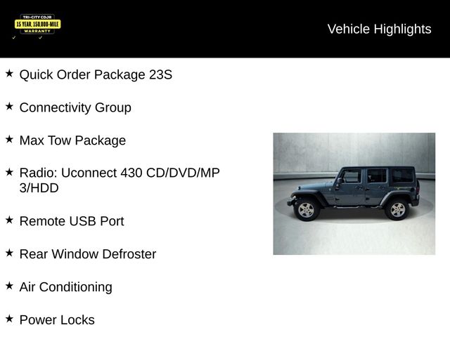 Standout features include the Uconnect 430 infotainment system with CD/DVD/MP3 playback, remote USB port, and Bluetooth connectivity. Enjoy the convenience of power windows, locks, and heated mirrors, as well as the security of a factory alarm system. The leather-wrapped steering wheel and shift knob add a touch of refinement, while the 17-inch aluminum wheels and deep-tint windows give this Wrangler an undeniably rugged aesthetic.
