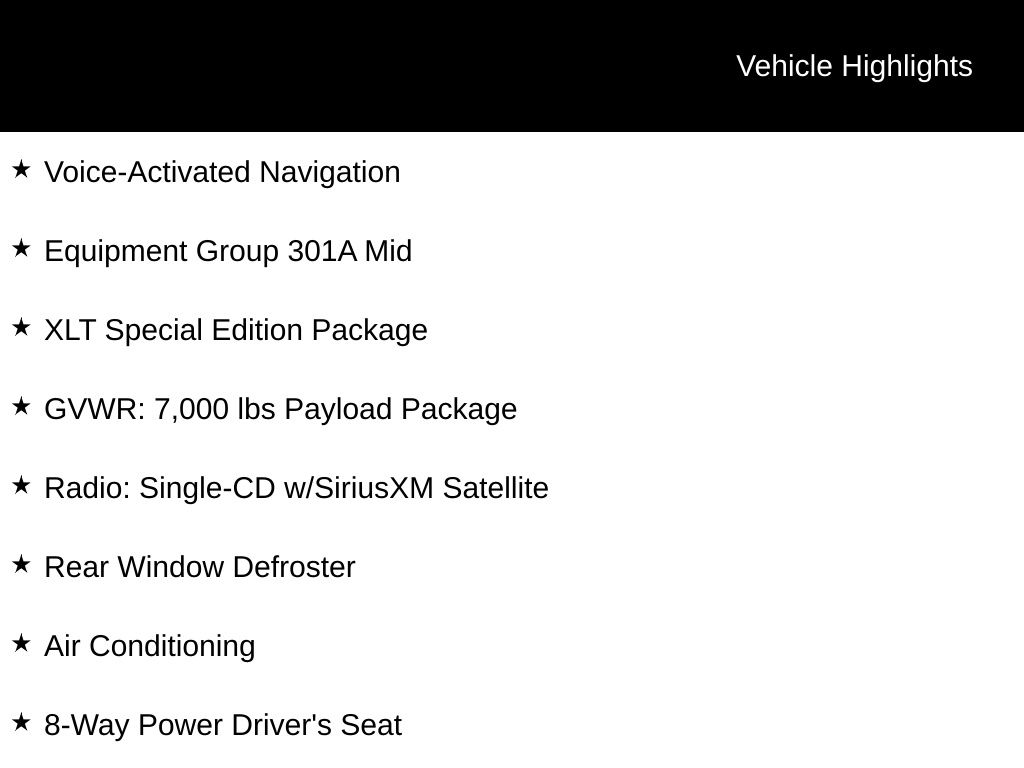 Beyond its impressive mechanical capabilities, this F-150 is packed with a wealth of premium features that cater to your every need. The XLT Special Edition Package adds a touch of style and sophistication, with a unique grille, bodyside decals, and 20-inch premium painted wheels. The Equipment Group 301A Mid and GVWR: 7,000 lbs Payload Package further enhance the truck's versatility and convenience.