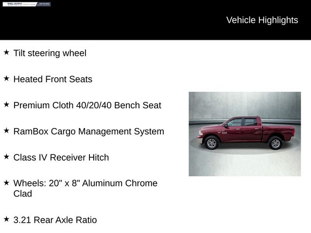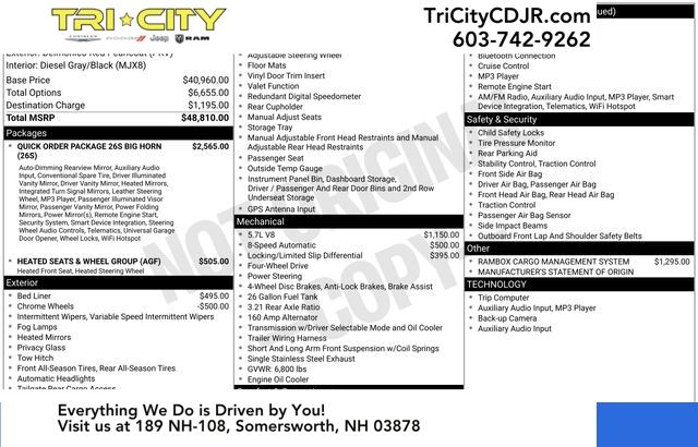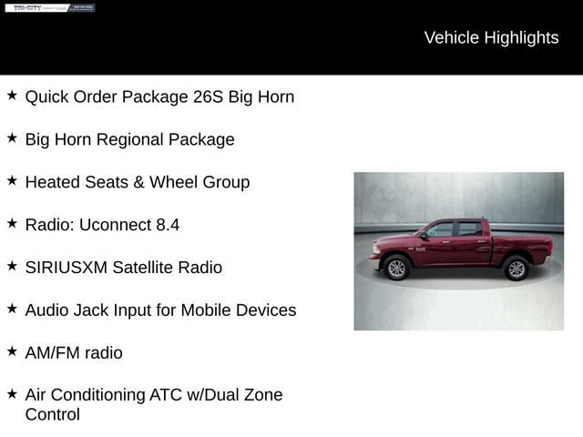 This Big Horn trim level also includes the Quick Order Package 26S, providing you with a host of additional conveniences and enhancements. Enjoy the benefits of remote start, an electroluminescent instrument cluster, and a leather-wrapped steering wheel, among other premium features.