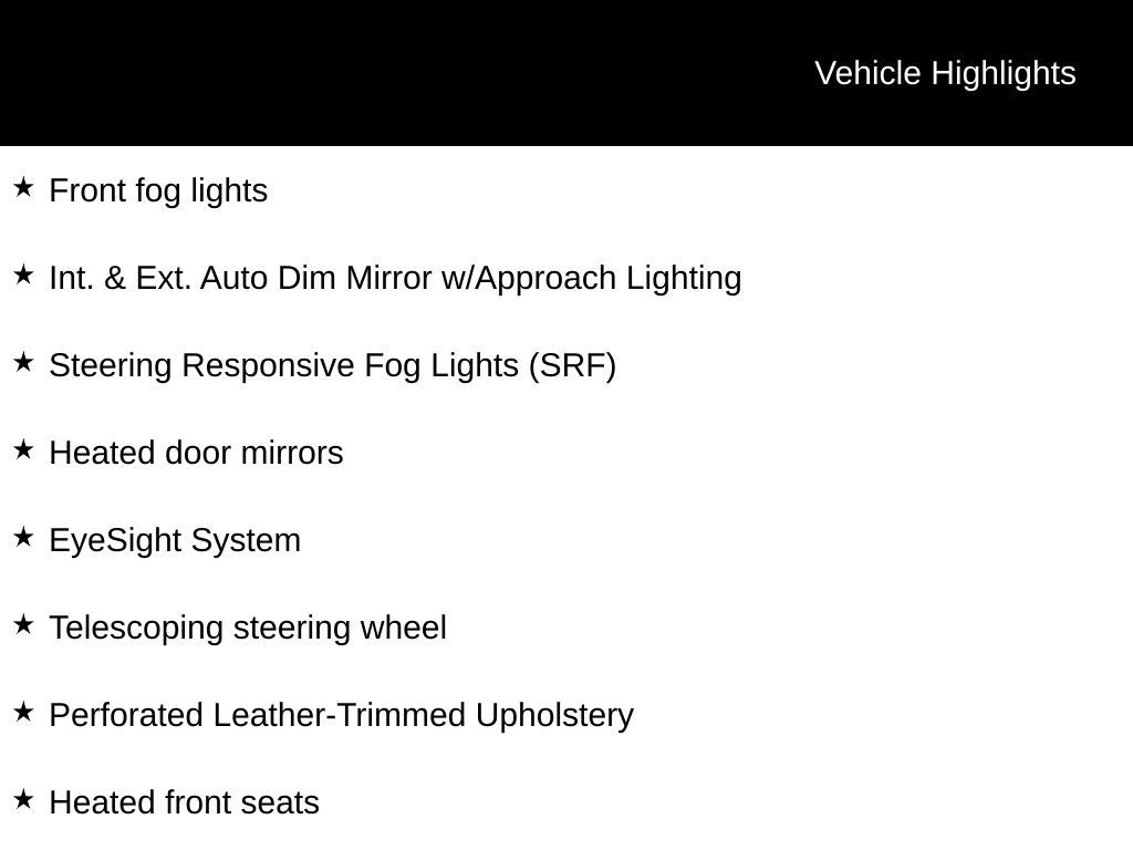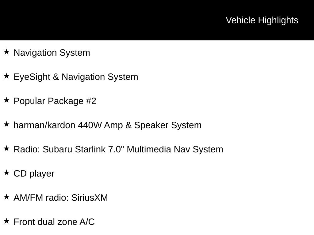 - Radio: Subaru Starlink 7.0" Multimedia Nav System