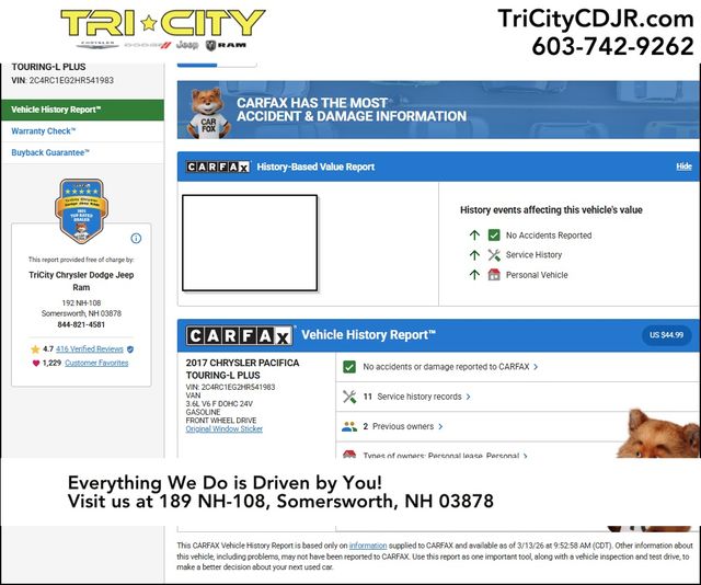 At our dealership, we pride ourselves on providing exceptional customer service and a hassle-free buying experience. We invite you to come in and experience the 2017 Chrysler Pacifica Touring L Plus 8-Passenger Seating for yourself. Let us demonstrate how this remarkable minivan can transform your daily driving and family adventures. Visit us today and let's discuss how we can put you behind the wheel of this exceptional vehicle.