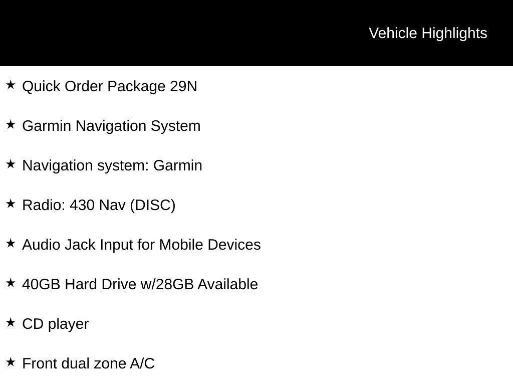 Elevate your driving experience with the Garmin navigation system, 40GB hard drive, and 6.5" touchscreen display. Stay connected and entertained with the SiriusXM Travel Link, CD player, and audio jack input for your mobile devices. Enjoy the ultimate in climate control with the front dual-zone air conditioning, rear air conditioning, and heated steering wheel.