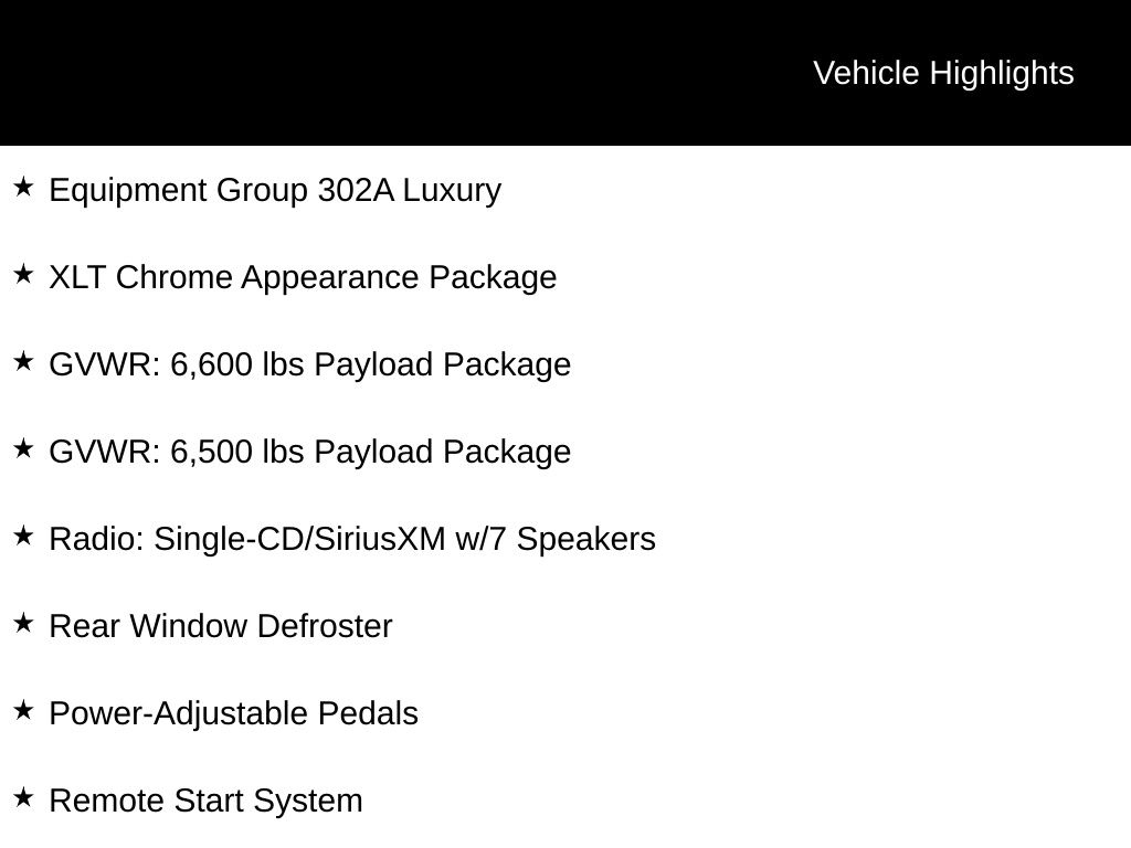 For added convenience and comfort, the F-150 XLT boasts a power-sliding rear window, heated front seats, and a leather-wrapped steering wheel. The XLT Chrome Appearance Package adds a touch of style with chrome accents throughout, while the LED box lighting and power-folding side mirrors enhance both form and function.