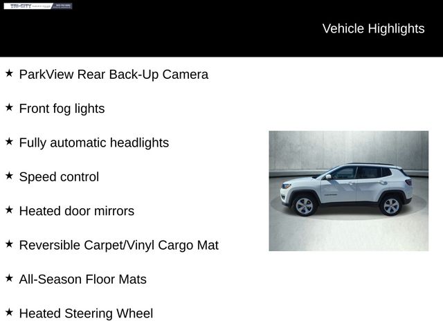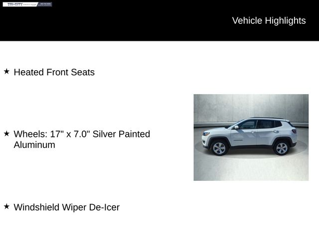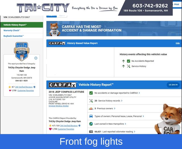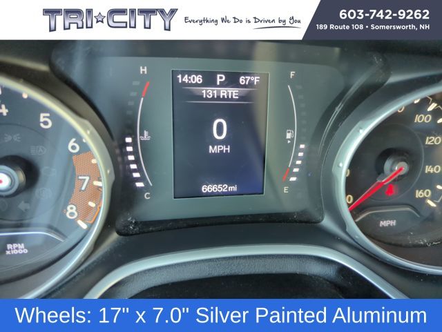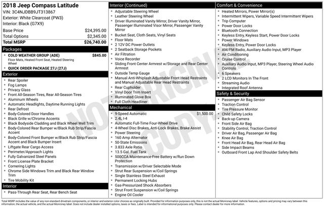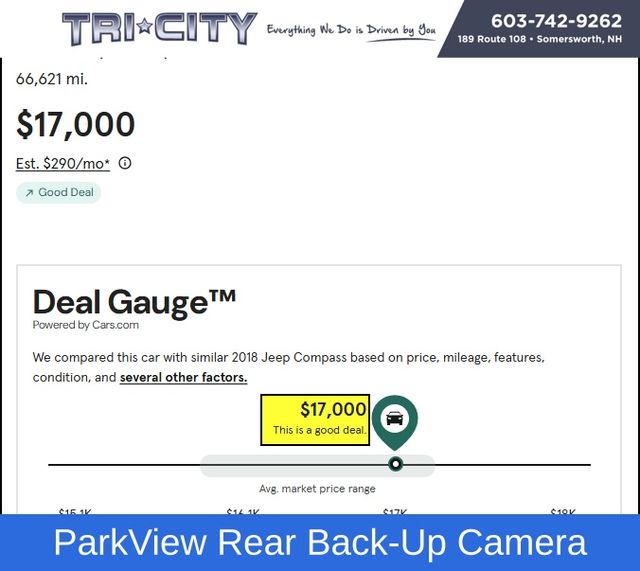 Fully serviced & Ready To Drive Home Today CALL NOW BEFORE ITS GONE!! (603) 207-8583Alignment checkedBrakes checkedBrake rotor(s) replacedDrivability/performance checkedFour tires balancedFour tires mountedOil and filter changedRear brake pads replacedRear brake rotor(s) replacedLooking for a stylish and capable SUV that can handle all your adventures? Look no further than this 2018 Jeep Compass Latitude. With its sleek white exterior and impressive 2.4L I4 engine paired with a 9-Speed Automatic transmission, this Compass is ready to take you wherever the road leads.Key features of this Compass Latitude include:• 9-Speed Automatic (9HP48)• COLD WEATHER GROUP - Includes Heated Steering Wheel, Reversible Carpet/Vinyl Cargo Mat, Windshield Wiper De-Icer, All-Season Floor Mats, Heated Front Seats• Cold Weather Group• Quick Order Package 27JThis Compass also boasts an impressive array of technology and convenience features, such as:• 6 Speakers• Radio: Uconnect 3 w/5" Display• Remote keyless entry• Steering wheel mounted audio controls• ParkView Rear Back-Up Camera• Fully automatic headlights• Heated door mirrors• Heated Steering Wheel• Heated Front Seats• Wheels: 17" x 7.0" Silver Painted AluminumWith its spacious interior, impressive fuel efficiency of 22 city / 30 highway MPG, and a wealth of safety features, this Compass Latitude is the perfect blend of style, capability, and practicality. Whether you're commuting to work, taking a road trip, or tackling your next outdoor adventure, this Jeep Compass Latitude is ready to handle it all.At our dealership, we pride ourselves on providing our customers with exceptional service and a stress-free buying experience. Our knowledgeable sales team is here to answer any questions you may have and help you find the perfect vehicle to fit your needs and budget.Don't let this opportunity pass you by. Schedule a test drive today and experience the power and versatility of the 2018 Jeep Compass Latitude for yourself. We're confident you'll be impressed by its performance, features, and overall value. Visit us at our showroom or give us a call to learn more.