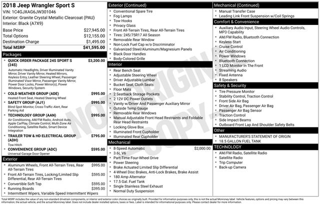 Imagine conquering the trails, navigating the city, and turning heads wherever you go – all in the iconic style and uncompromising capability of this 2018 Jeep Wrangler Sport S. Schedule a test drive today and experience the freedom and versatility that only a Wrangler can deliver.