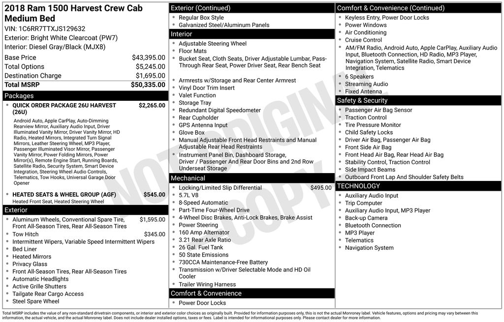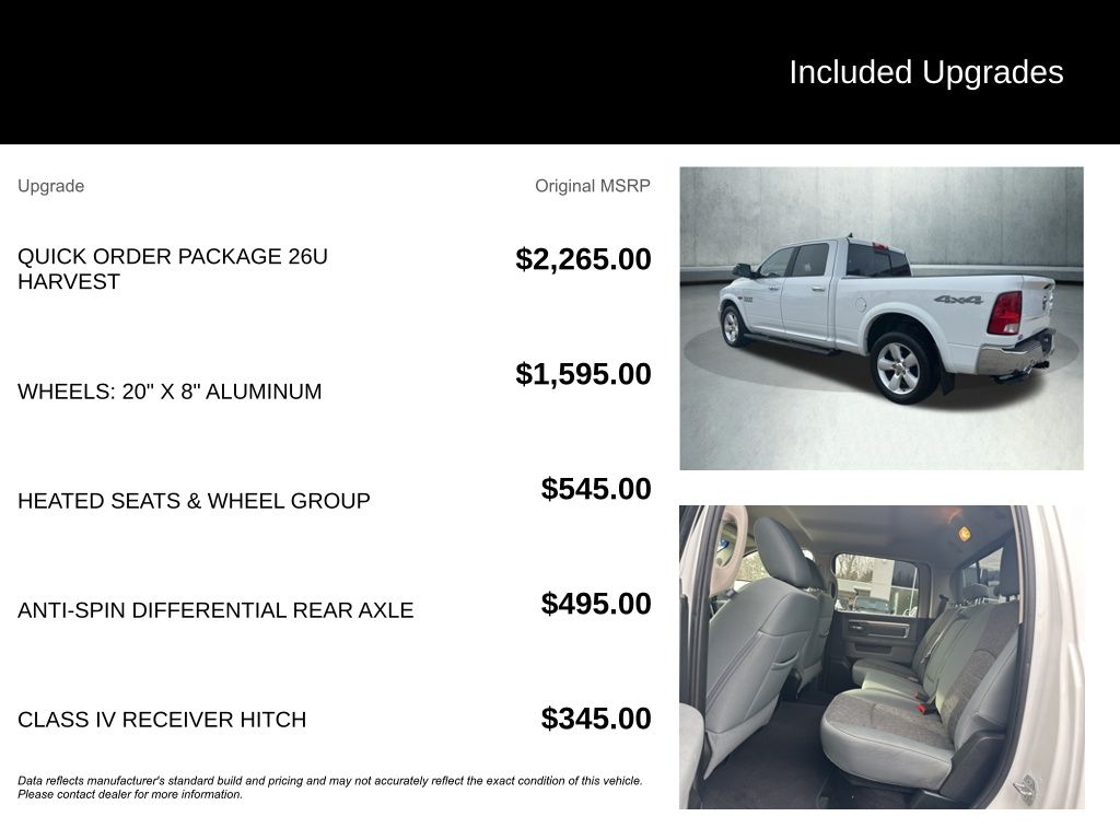 2018 Ram 1500 Harvest 4x4 Decal, Air Conditioning, Auto-Dimming Exterior Mirrors, Auto-Dimming Rear-View Mirror, Black Tubular Side Steps, Bright Grille, Chrome Exterior Mirrors, Dual Rear Exhaust w/Bright Tips, Electroluminescent Instrument Cluster, Exterior Mirrors Courtesy Lamps, Exterior Mirrors w/Supplemental Signals, Front & Rear Rubber Floor Mats, Glove Box Lamp, GPS Navigation, Heated Front Seats, Heated Seats & Wheel Group, Heated Steering Wheel, Humidity Sensor, Leather Wrapped Steering Wheel, LED Bed Lighting, MOPAR Rear Bumper Step Extension, Overhead Console w/Garage Door Opener, ParkView Rear Back-Up Camera, Power 10-Way Driver Seat, Power Lumbar Adjust, Power Multi-Function F/Away Mirrors, Power-Folding Mirrors, Premium Cloth Bucket Seats, Quick Order Package 26U Harvest (DISC), Radio: Uconnect 4C Nav w/8.4" Display, Rear Dome w/On/Off Switch Lamp, Rear Mud Flaps, Remote Start System, Security Alarm, Spray In Bedliner, Steering Wheel Mounted Audio Controls, Sun Visors w/Illuminated Vanity Mirrors, Tow Hooks, Traction control, Underhood Lamp, Wheels: 17" x 7" Aluminum Chrome Clad (DISC). Clean CARFAX.