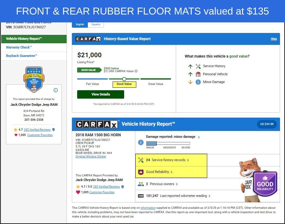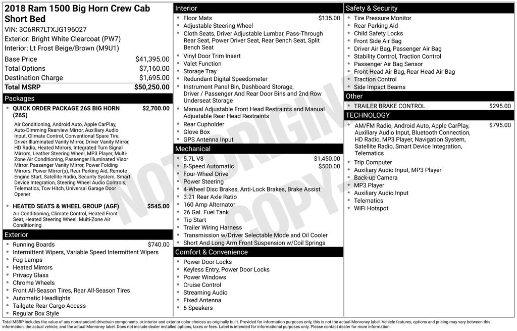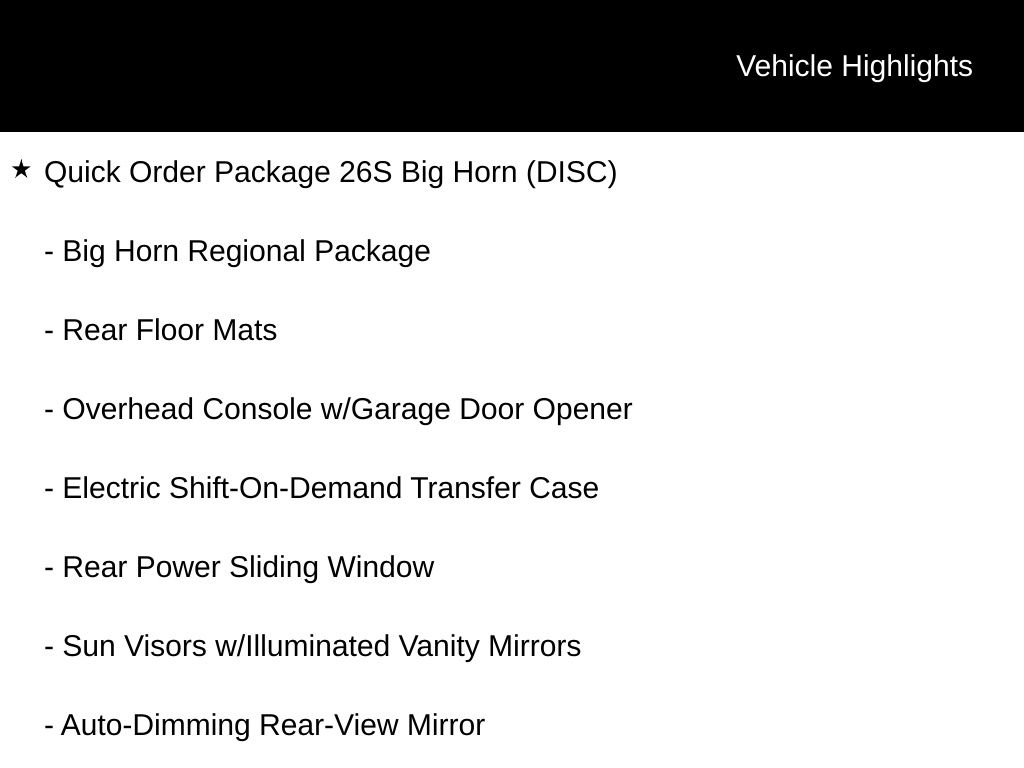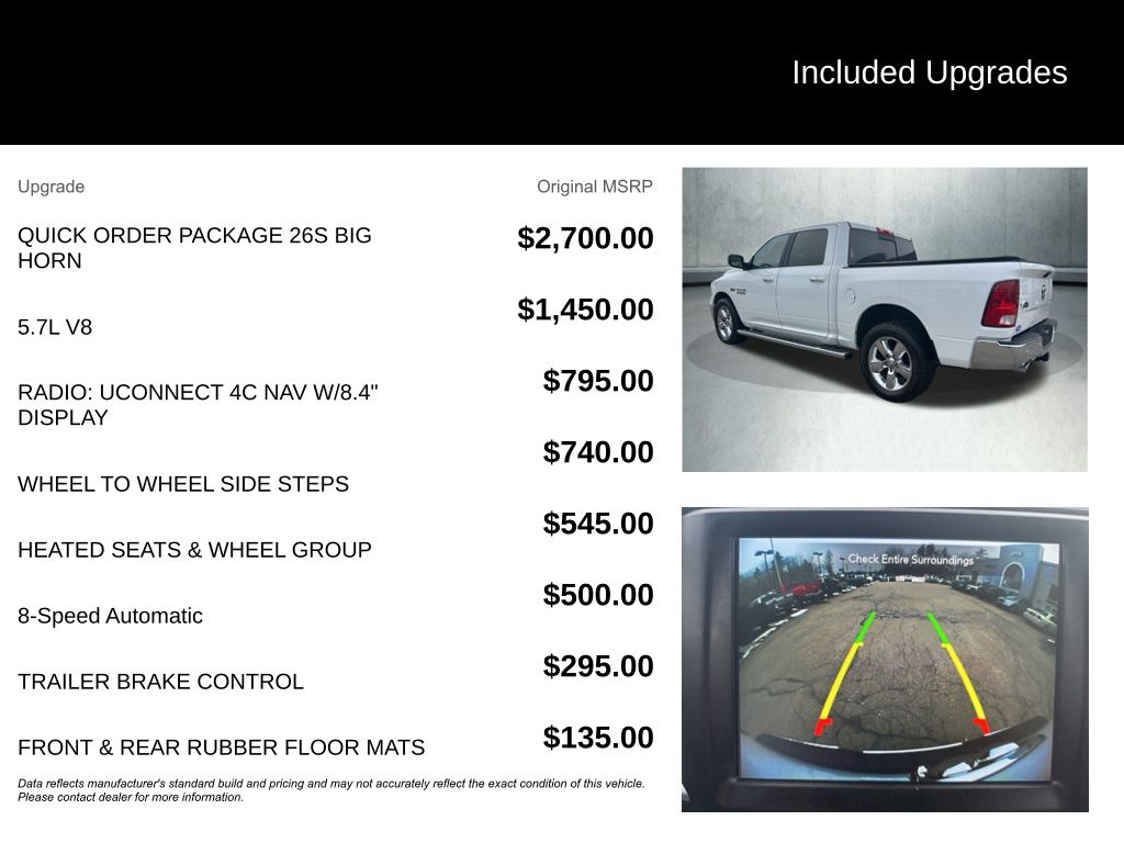 2018 Ram 1500 Big Horn Air Conditioning ATC w/Dual Zone Control, Auto-Dimming Exterior Mirrors, Auto-Dimming Rear-View Mirror, Big Horn Badge, Big Horn Regional Package, Bright/Bright Billets Grille, Class IV Receiver Hitch, Dual Rear Exhaust w/Bright Tips, Electric Shift-On-Demand Transfer Case, Electroluminescent Instrument Cluster, Exterior Mirrors Courtesy Lamps, Exterior Mirrors w/Supplemental Signals, Front Fog Lamps, Glove Box Lamp, GPS Navigation, Heated Front Seats, Heated Seats & Wheel Group, Heated Steering Wheel, Humidity Sensor, Leather Wrapped Steering Wheel, LED Bed Lighting, Overhead Console w/Garage Door Opener, Panic alarm, ParkSense Front/Rear Park Assist System, ParkSense Rear Park Assist System, Power Heated Fold-Away Mirrors, Power-Folding Mirrors, Premium Cloth 40/20/40 Bench Seat, Quick Order Package 26S Big Horn (DISC), Radio: Uconnect 4C w/8.4" Display, Rear Dome w/On/Off Switch Lamp, Rear Floor Mats, Rear Power Sliding Window, Remote Start System, Security Alarm, Speed control, Steering Wheel Mounted Audio Controls, Sun Visors w/Illuminated Vanity Mirrors, Wheels: 20" x 8" Aluminum Chrome Clad.