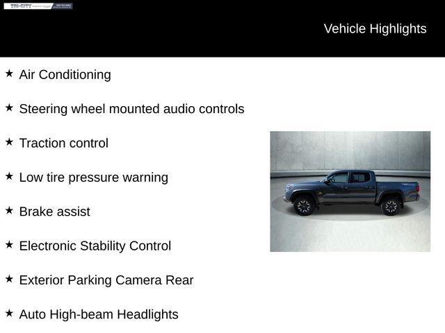 ECHANICAL & PERFORMANCE - 3.5L V6 Atkinson Cycle with Dual VVT-i 278hp @ 6000rpm/265 lb-ft @ 4600rpm - 6-Spd Automatic Transmission - 4WDemand: Part-Time 4x4 Sys w/2-speed, & Electronically Controlled Transfer Case - Off-Road Tuned Susp w/Bilstein Shcks - Locking Rear Diff; Multi-Terrain Select Crawl Control; Hill-Start Assist Ctrl - 16" Machined Contrast Alloy Wheels w/P265/70R16 Tire - Towing Receiver Hitch, Eng Oil Cooler, Pwr Steering Cooler, 130-Amp Alt, 4/7-Pin Connector, & Trailer Sway Cntrl SAFETY & CONVENIENCE - Toyota Safety Sense(TM) P (TSS-P) Pre-Collisn Sys w/Ped Det (PCS w/PD), Lane Departure Alert (LDA), Sway Warning System (SWS), Automatic High Beams (AHB) and Dynamic Radar Cruise Control (DRCC) - Rear Backup Camera - Dr & Fr Pass Advanced Airbag System Seat-Mounted Side & Side Curtain Airbags - 3-Pt Seatbelts for All Seating Positions - Tire Pressure Monitor Sys w/Auto Locate EXTERIOR - Prjctr Beam Hdlghts w/Blk Bzls & LED DRL - 5' Composite Bed w/120V Pwr Outlet - Deck Rail System w/4 Adj Tie-Down Cleats - Easy Lower,Lockable & Removable Tailgate