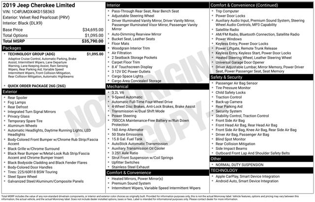 Fully serviced & Ready To Drive Home Today CALL NOW BEFORE ITS GONE!! (603) 207-8583Brakes checkedDrivability/performance checkedFour tires balancedFour tires mountedFront brake pads replacedFront brake rotor(s) replacedOil and filter changedLooking for a capable and stylish SUV that can handle your daily commute and weekend adventures? Look no further than this 2019 Jeep Cherokee Limited. With its striking red exterior and a host of advanced features, this vehicle is the perfect blend of form and function.• Technology Group: $995.00 Customer Value!! Includes Side Distance Warning, Adaptive Cruise Control with Stop & Go, Advanced Brake Assist, Auto High Beam Headlamp Control, Rain Sensitive Windshield Wipers, Parallel/Perpendicular Park/Unpark Assist with Stop, Full Speed Forward Collision Warning Plus, and Lane Departure Warning Plus.• AM/FM radio: SiriusXM, Integrated Voice Command with Bluetooth, Radio: Uconnect 4 with 8.4" Display, Automatic temperature control, Front dual zone A/C, Rear window defroster, Memory seat, Power driver seat, Remote keyless entry, Steering wheel mounted audio controls, and much more.A/C Auto Temperature Control with Dual Zone ControlHeated Front SeatsAuto–Dimming Rear View MirrorLeather–Wrapped Steering WheelHeated Steering WheelAutomatic HeadlampsLED Daytime Running HeadlampsLED Tail LampsWindshield Wiper De–IcerCapless Fuel–FillerTire–Fill AlertHill Start AssistParkView® Rear Back Up CameraBlind–Spot and Cross–Path DetectionKeyless Enter–N–Go™ / Passive EntryRemote–Start SystemAll Speed Traction ControlPowered by a 3.2L V6 engine and equipped with 4WD, this Jeep Cherokee delivers an impressive 19 city/27 highway MPG, making it both capable and efficient. The spacious interior, with its premium leather-trimmed bucket seats, provides ample room for you and your passengers to enjoy the ride in comfort.But the real standout features of this vehicle are its advanced safety and technology capabilities. With the Technology Group package, you'll have access to cutting-edge driver-assist features like Adaptive Cruise Control, Full Speed Forward Collision Warning Plus, and Lane Departure Warning Plus. These systems work together to help keep you and your loved ones safe on the road.Imagine the convenience of the Parallel/Perpendicular Park/Unpark Assist, which can seamlessly guide you into tight parking spots. And with the power liftgate, loading up your gear has never been easier. The Uconnect 4 system with an 8.4" display provides a user-friendly interface for all your infotainment needs, including seamless integration with Apple CarPlay and Android Auto.This 2019 Jeep Cherokee Limited is more than just a capable SUV – it's a true companion that can elevate your driving experience. With its impressive performance, advanced technology, and striking good looks, it's the perfect vehicle to take on the open road and make the most of your adventures.Don't miss out on this exceptional opportunity. Schedule a test drive today and experience the power and versatility of the 2019 Jeep Cherokee Limited for yourself. We're confident you'll be impressed by its exceptional value and the unparalleled driving experience it offers.