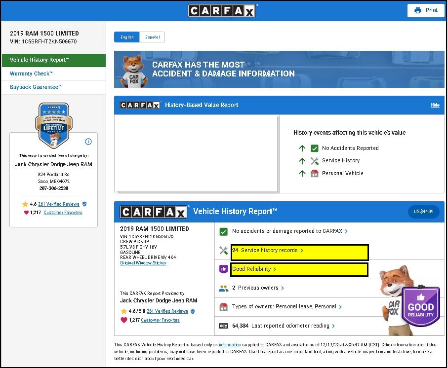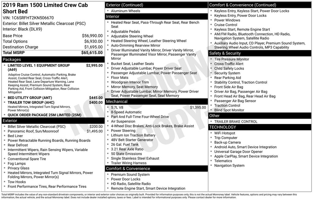 With its impressive 21 MPG highway fuel efficiency and spacious, well-appointed cabin, this 2019 Ram 1500 Limited is the ultimate blend of power, technology, and luxury. Experience the difference for yourself and schedule a test drive today. We're confident this truck will exceed your expectations and become your trusted companion on the road ahead.