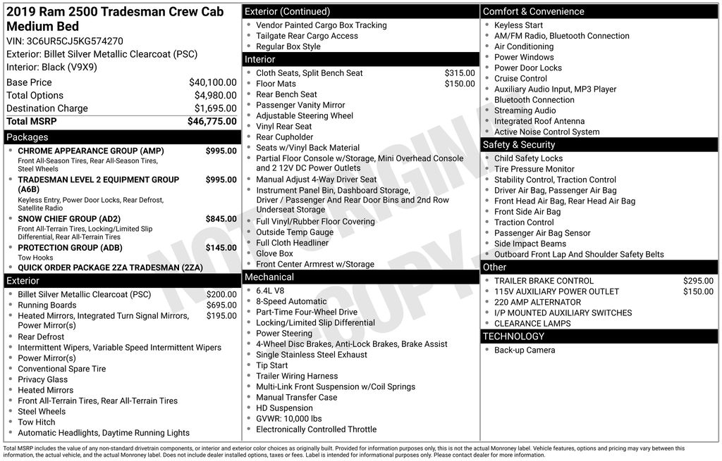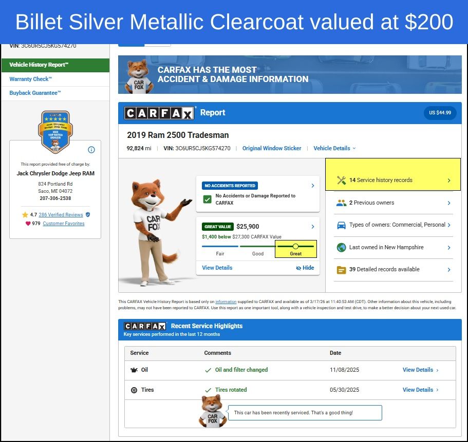 2019 Ram 2500 Tradesman 115V Auxiliary Power Outlet, 220 Amp Alternator, 3.73 Axle Ratio, 400W Inverter, Air Conditioning, Anti-Spin Differential Rear Axle, Brake assist, Chrome Appearance Group, Cloth 40/20/40 Bench Seat, Delay-off headlights, Electronic Stability Control, Exterior Mirrors w/Heating Element, Fully automatic headlights, Illuminated entry, Mirror Running Lights, ParkView Rear Back-Up Camera, Power Adjust & Heated Black Tow Mirrors, Quick Order Package 2ZA Tradesman, Rear Folding Seat, Rear Power Sliding Window, Rear Window Defroster, Remote Keyless Entry, SiriusXM Satellite Radio, Snow Chief Group, Tradesman Level 2 Equipment Group, Trailer Brake Control, Trailer Tow Mirrors, Wheels: 18" x 8.0" Steel Chrome Clad. Clean CARFAX.