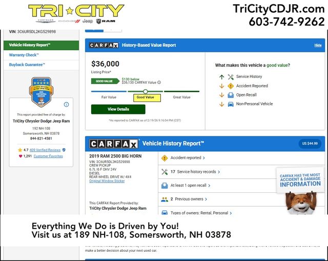 Whether you're hauling heavy loads, towing a trailer, or simply enjoying the open road, this 2019 Ram 2500 Big Horn is the perfect companion. Its combination of strength, technology, and comfort make it a standout in the heavy-duty truck segment. Experience the difference for yourself and schedule a test drive today. We're confident you'll be impressed by the capabilities and value this Ram 2500 has to offer.
