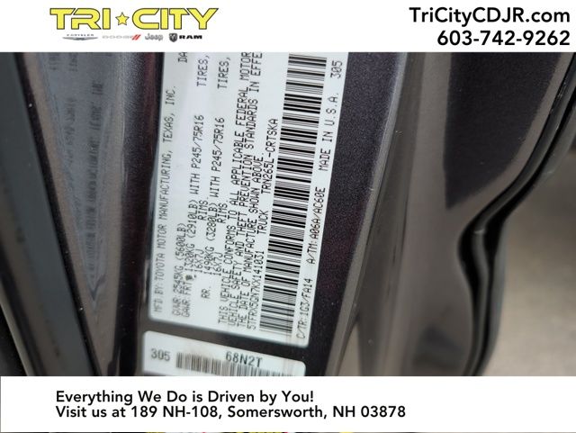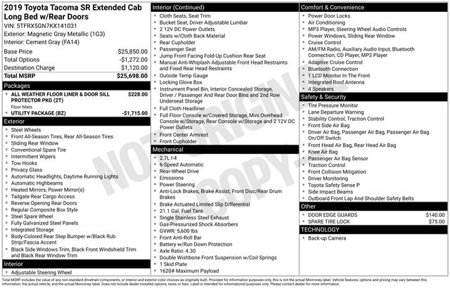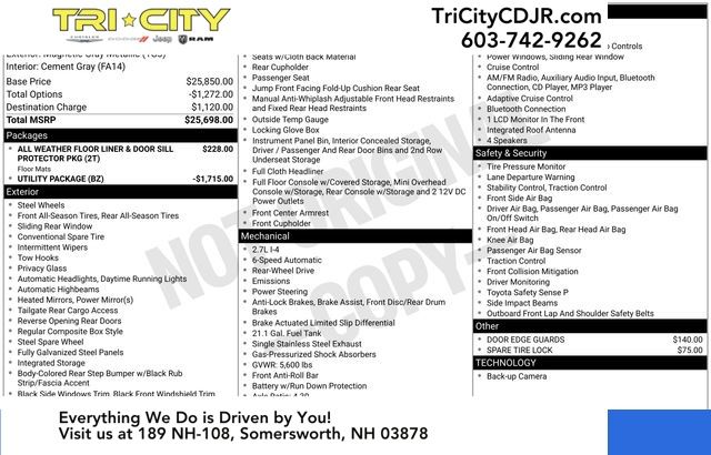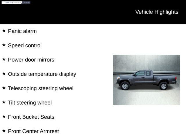 EXTERIOR - Projector Beam Headlights - Pwr Side Mirrors - 6' Composite Bed - Deck Rail System w/4 Adj Tie-Down Cleats - Easy Lower,Lockable & Removable Tailgate INTERIOR - Fabric Trim Seats w/Dr Lumbar Support - Urethane Steering Wheel w/Audio Cntrls - Pwr Wndws w/Dr Auto Dwn and Pwr Door Locks - Entune Audio, 6.1"Touch Screen, AM/FM/CD 1 USB Media Port, 2 USB Chg-Ports HandsFree BT Phone/
