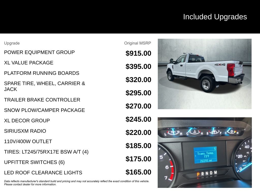 2020 Ford F-350SD XL 4WD, 110V/400W Outlet, 240 Amp Alternator, 3.73 Axle Ratio, 4-Wheel Disc Brakes, ABS brakes, Air Conditioning, Brake assist, Cloth 40/20/40 Split Bench Seat, Delay-off headlights, Electronic Stability Control, Exterior Parking Camera Rear, Fully automatic headlights, GVWR: 10,900 lb Payload Package, LED Roof Clearance Lights, Privacy Glass, Rear Stabilizer Bar, Snow Plow/Camper Package, SYNC 3 Communications & Entertainment System, Trip computer, Upfitter Switches (6), Wheels: 18" Sparkle Silver Painted Cast Aluminum. CARFAX One-Owner. Clean CARFAX.