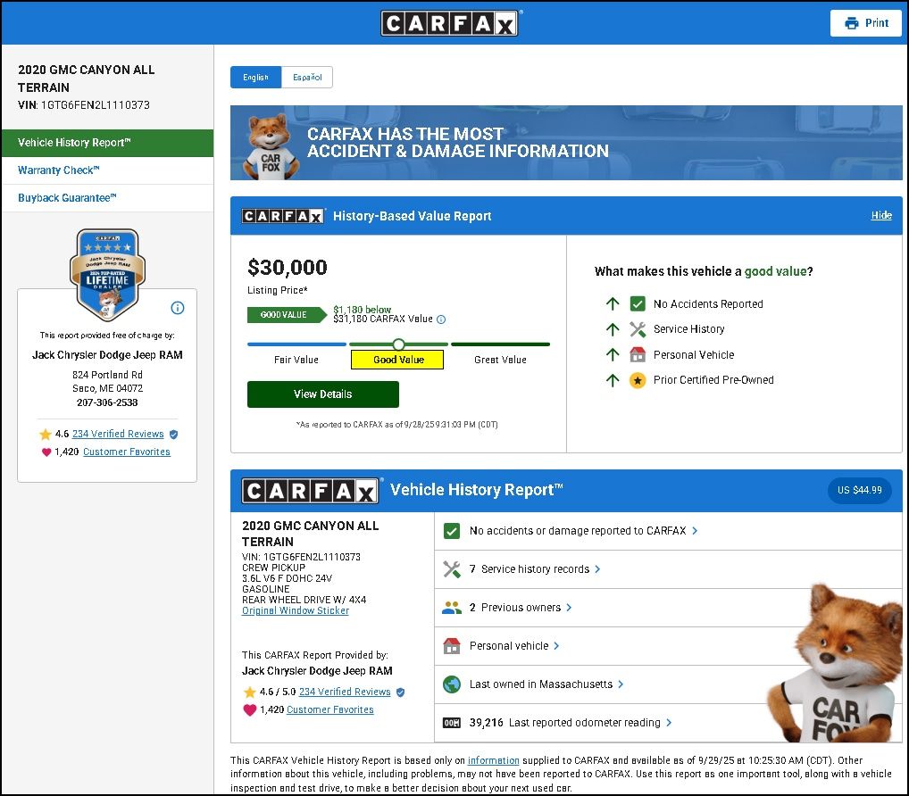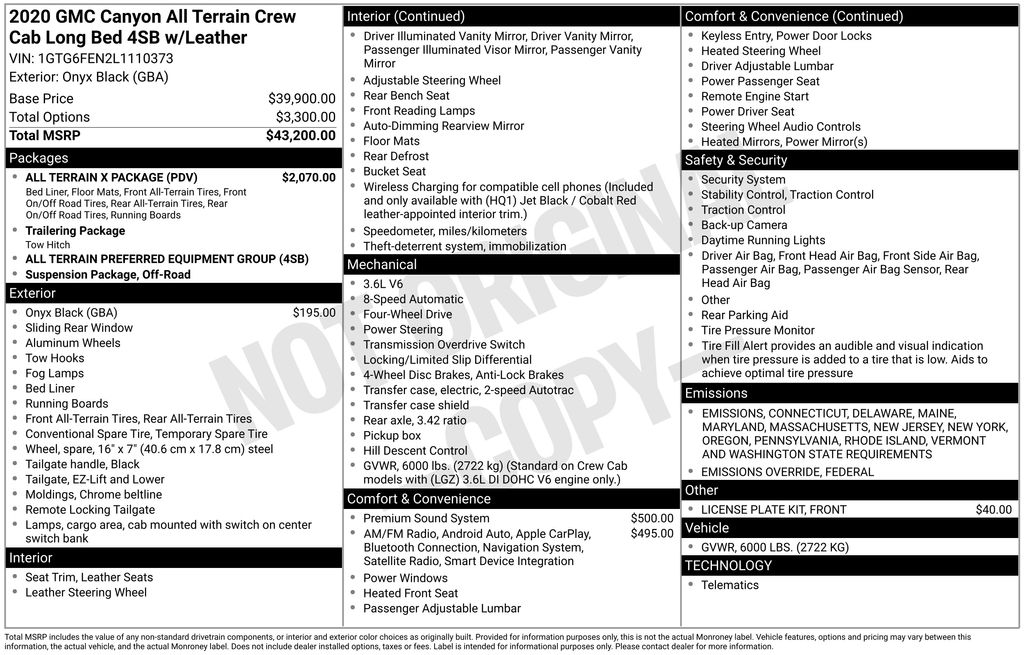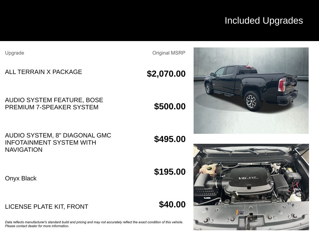 Discover the ultimate off-road companion in the 2020 GMC Canyon All Terrain. This rugged and capable truck is built to take on any adventure, whether you're conquering the trails or tackling the daily commute.Boasting an impressive array of features, this Canyon All Terrain is equipped to handle whatever the road throws your way. Highlights include:TOTAL OPTIONS $3,260.00 Value!!• LEATHER-APPOINTED FRONT SEATS• ALL TERRAIN X PACKAGEALL TERRAIN X PACKAGE INCLUDES: $2,070.00 Customer Value!!• SPRAY-ON BEDLINER• DURATRAC TIRES• ALL WEATHER FLOOR LINERS• OFF-ROAD ASSIST STEPSAUDIO SYSTEM- PREMIUM BOSE 500.00 Customer Value!!GMC INFOTAINMENT SYSTEM WITH $495.00 Customer Value!!NAVIGATION8" DIAGONAL COLOR TOUCH-SCREENVOICE RECOGNITION, BLUETOOTHAUDIO STREAMING, APPLE CARPLAY& ANDROID AUTO CAPABLE,IN-VEHICLE APPS ANDPERSONALIZATION CAPABLEONYX BLACK $ 195.00 Value!!REAR AXLE - 3.42 RATIO• Bose Premium 7-Speaker Audio System Feature• 8" Diagonal GMC Infotainment System with Navigation• Onyx Black Exterior with Black Accents• 3" Round Black Off-Road Step Bars• Black Spray-On Bedliner with GMC Logo• AUTO LOCKING REAR DIFFERENTIAL• TRAILERING EQUIPMENT PACKAGE• OFF-ROAD SUSPENSION• CRUISE CONTROL• TRANSFER CASE SHIELD• HILL DESCENT CONTROLSAFETY & SECURITY• HD REAR VISION CAMERA• REAR PARK ASSIST• THEFT-DETERRENT SYSTEM• STABILITRAK-STABILITY CONTROL SYSTEM W/ TRACTION CONTROL• TEEN DRIVERCONNECTIVITY & TECHNOLOGY• REMOTE KEYLESS ENTRY• REMOTE VEHICLE START• SIRIUSXM RADIO CAPABLE, ALL ACCESS TRIAL W/ SUBSCRIPTION SOLD SEPARATELY• ONSTAR (R) SERVICES & 4G LTE WI-FI (R) AVAILABLE; SEE ONSTAR.COM FOR TERMS• GMC INFOTAINMENT SYSTEM W/ 8" DIAG. HD COLOR TOUCHSCREEN VOICE RECOGNITIONEXTERIOR• 17" DARK ARGENT METALLIC CAST ALUMINUM WHEELS• ALL-TERRAIN TIRES• PROJECTOR-TYPE HEADLAMPS W/ LED SIGNATURE• FRONT FOG LAMPS• HEATED OUTSIDE MIRRORS• FRONT RECOVERY HOOKS• EZ LIFT AND LOWER TAILGATE• LOCKING TAILGATE• CORNERSTEP REAR BUMPERThe Canyon's powerful V6 engine and 4WD system ensure you'll have the power and traction to conquer any terrain. With a spacious and well-appointed interior, this truck offers the perfect blend of capability and comfort. Enjoy features like heated front seats, a heated steering wheel, and wireless charging for your compatible devices.But the Canyon All Terrain is more than just a rugged workhorse. It's also a stylish and modern pickup that will turn heads wherever you go. The bold, aggressive exterior design and premium interior touches create a truly impressive package.Whether you're tackling the great outdoors or navigating the busy city streets, the 2020 GMC Canyon All Terrain is the perfect companion. With its impressive performance, advanced technology, and premium amenities, this truck is the ultimate expression of power, capability, and refinement.At our dealership, we understand that finding the right vehicle is about more than just numbers on a page. That's why we're committed to providing you with a personalized and stress-free buying experience. Our knowledgeable team is here to answer any questions you may have and help you discover the perfect Canyon All Terrain to fit your lifestyle.