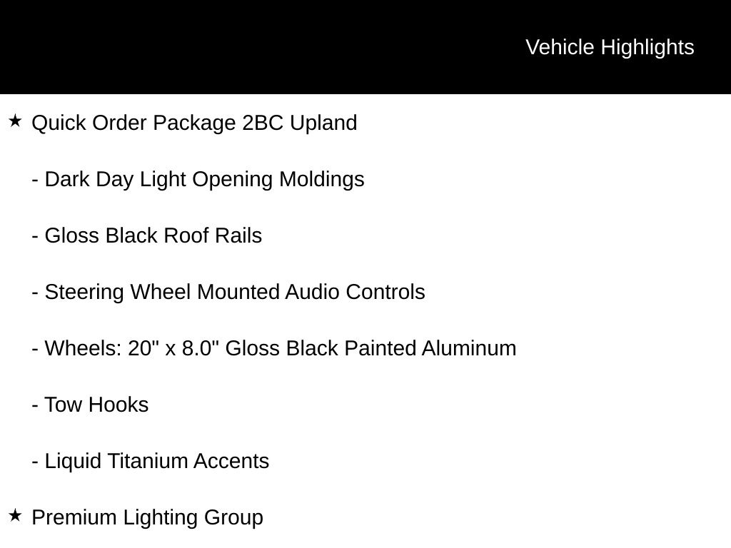 - Wheels: 20" x 8.0" Gloss Black Painted Aluminum