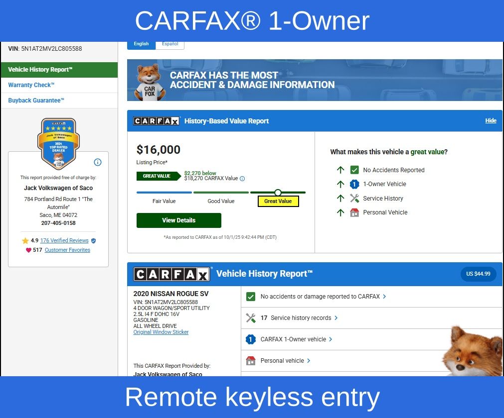 Vehicle Fully serviced & Ready to Drive Home Today CALL NOW BEFORE ITS GONE!! 866-778-9667Pre-delivery inspection completedAir filter replacedBrakes checkedFront brake pads replacedFront brake rotor(s) replacedEmissions or safety inspection performedOil and filter changedDiscover the perfect balance of style, comfort, and advanced technology in this 2020 Nissan Rogue SV. This exceptional SUV is designed to elevate your driving experience, offering a seamless blend of performance, convenience, and safety features that will leave you captivated.Highlighted by a sleek gray exterior, this Nissan Rogue SV boasts an impressive array of premium features, including:• Premium Package $1800.00 Customer Value!! Premium package added ProPilot Assist, a semi-autonomous driver-assistance feature!Automatic Emergency Braking with Pedestrian DetectionRear Automatic BrakingBlind Spot WarningRear Cross Traffic AlertLane Departure WarningHigh Beam Assist• Radio: AM/FM/CD/AUX NissanConnect with Navigation• Automatic temperature control• Front dual zone A/C• Power driver seat• Remote keyless entry• Steering wheel mounted audio controls• Traction control• 4-Wheel Disc Brakes• Electronic Parking Brake• Blind Spot Warning• Brake assist• Electronic Stability Control• Lane Departure Warning SystemPowered by a 2.5L I4 DOHC 16V engine and equipped with Xtronic CVT and All-Wheel Drive, this Rogue SV delivers an exceptional balance of power and efficiency, with an EPA-estimated 25 city/32 highway MPG. Experience the confidence and control of this capable SUV, whether navigating city streets or exploring the open road.Step inside and be captivated by the premium interior, featuring a Heated Leather-Wrapped Steering Wheel, Intelligent Aroundview Monitor, and Memory Driver Seat & Outside Mirrors. Enjoy the convenience of NissanConnect with Navigation, Apple CarPlay, and Android Auto, seamlessly integrating your digital world with your driving experience.Designed with your safety in mind, the Rogue SV is equipped with a suite of advanced driver-assistance technologies, including ProPILOT Assist, Intelligent Cruise Control, and Steering Assist. These cutting-edge features work together to help keep you and your loved ones secure on the road.At our dealership, we understand the importance of finding the perfect vehicle that meets your needs and exceeds your expectations. That's why we're excited to offer this exceptional 2020 Nissan Rogue SV, a true testament to Nissan's commitment to quality and innovation.Don't miss your opportunity to experience the exceptional capabilities and premium features of this Rogue SV. Visit our showroom today and let our knowledgeable team guide you through a test drive. We're confident you'll be impressed by the exceptional value and unparalleled driving experience this SUV has to offer.