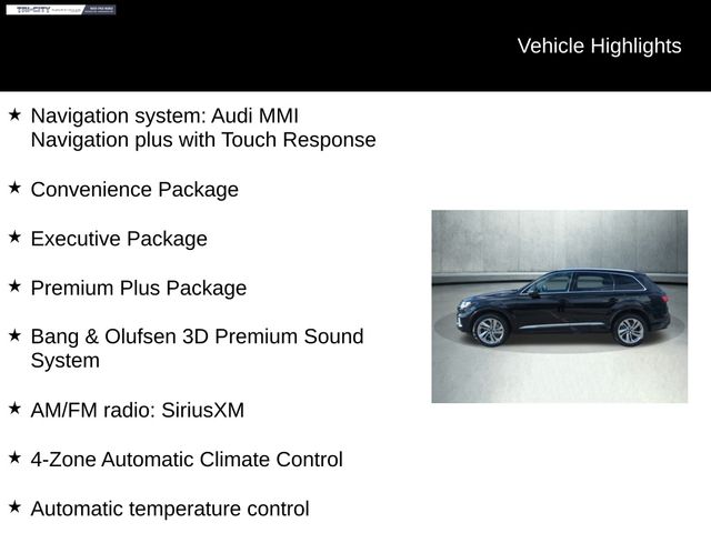 The Convenience Package, Executive Package, and Premium Plus Package further elevate this Q7, providing a wealth of advanced technologies and luxurious amenities to enhance your driving experience. Imagine the convenience of a power liftgate, the comfort of heated and ventilated front seats, and the peace of mind that comes with Audi's comprehensive safety features.