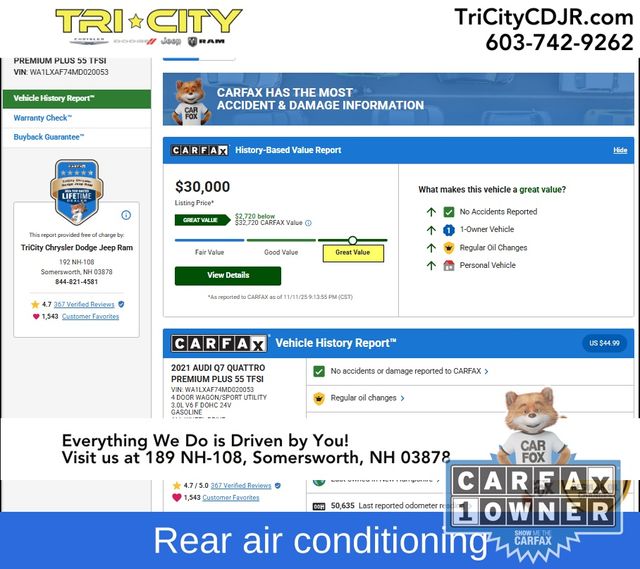Powered by a robust 3.0L TFSI V6 DOHC engine and equipped with Audi's renowned quattro all-wheel drive system, this Q7 delivers exceptional performance and confidence on the road. With a city fuel economy of 18 MPG and 23 MPG on the highway, you'll enjoy the perfect balance of power and efficiency.