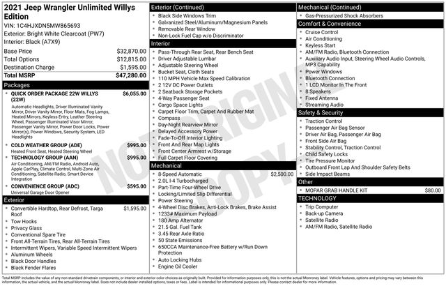 Whether you're seeking a capable off-road companion or a versatile daily driver, this 2021 Jeep Wrangler Unlimited Willys is the perfect choice. With its exceptional performance, advanced technology, and head-turning style, this Wrangler is sure to exceed your expectations.