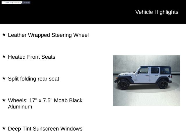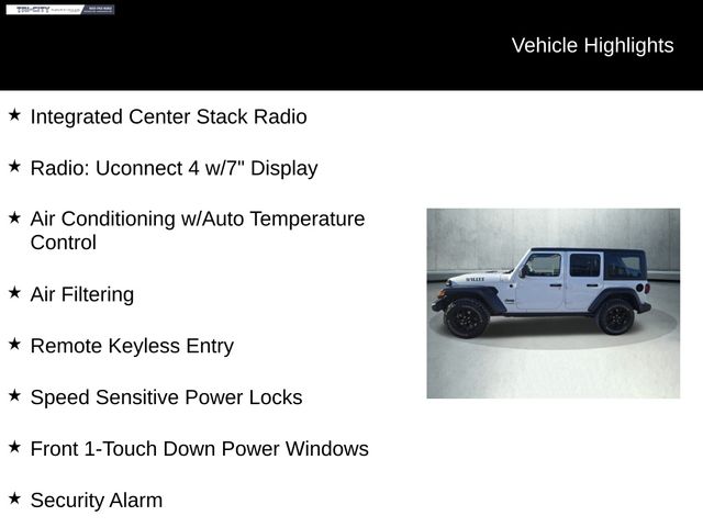 This Wrangler Unlimited Willys is the perfect blend of rugged capability and modern convenience. With its 4-wheel drive system, you'll conquer any terrain with confidence, while the array of advanced technology features keep you connected and entertained on every journey.