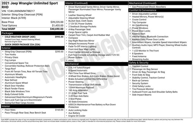 Don't miss your chance to own this exceptional 2021 Jeep Wrangler Unlimited Sport RHD Right Hand Drive. Contact us today to schedule a test drive and see for yourself why this Jeep is the ultimate adventure companion.