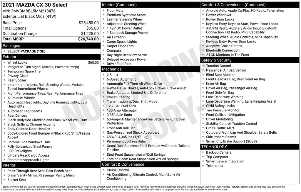 Highlighted by its sleek black exterior and well-appointed interior, the CX-30 Select commands attention wherever it goes. Its 6-speed automatic transmission with all-wheel drive delivers a confident and engaging ride, while the efficient I4 engine provides an exceptional balance of power and fuel economy, with an EPA-estimated 24 city/31 highway MPG.