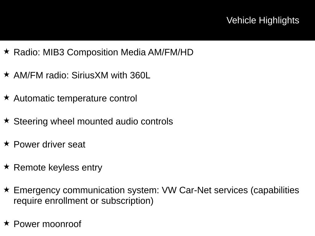 Step inside the Tiguan and be welcomed by a wealth of premium amenities, including a panoramic power moonroof, heated front seats, and a state-of-the-art infotainment system with SiriusXM radio and VW Car-Net connectivity. The spacious interior and versatile cargo area make this SUV the perfect companion for your adventures, whether it's a weekend getaway or a daily commute.