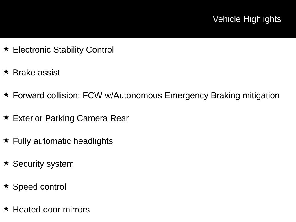 - FCW w/Autonomous Emergency Braking forward collision mitigation