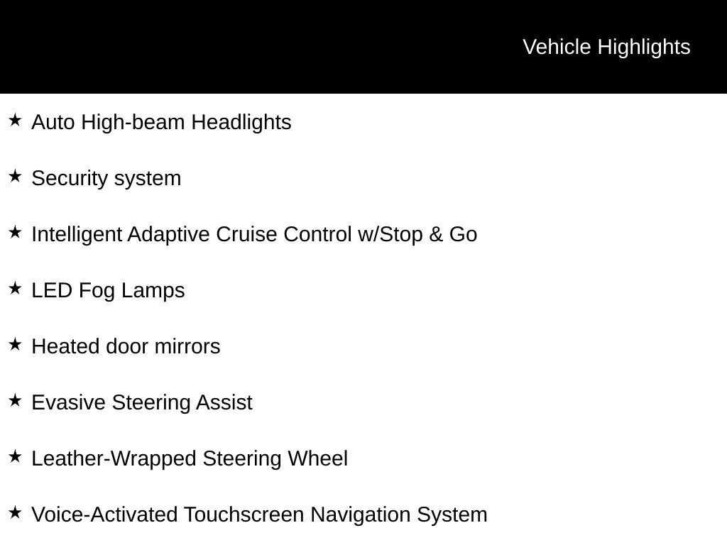 - Ford Co-Pilot360 Assist+: Evasive Steering Assist, Voice-Activated Touchscreen Navigation, Intelligent Adaptive Cruise Control with Stop & Go, lane centering, and speed sign recognition.