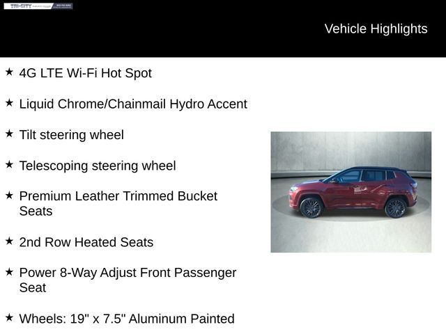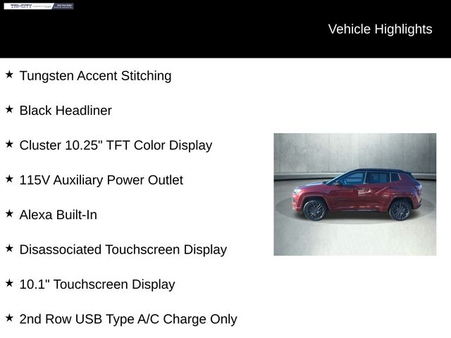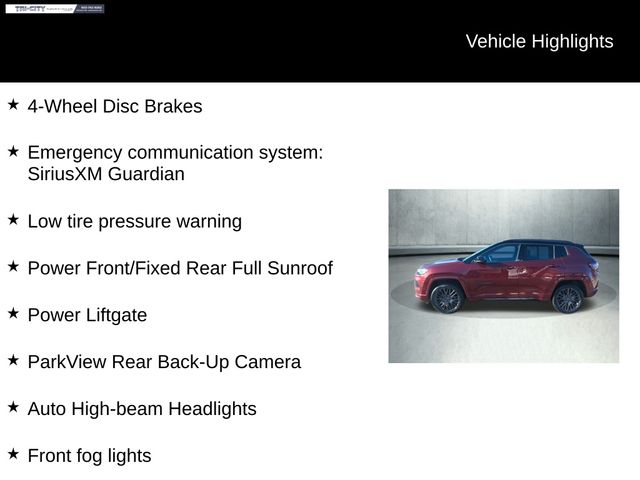 The impressive list of features continues, with the High Altitude package offering an array of premium amenities that truly set this Compass apart. Enjoy the convenience of the Foot Activated Open 'N Go Liftgate, the sophistication of the Power Liftgate, and the added safety of the ParkView Rear Back-Up Camera and Auto High-Beam Headlights.