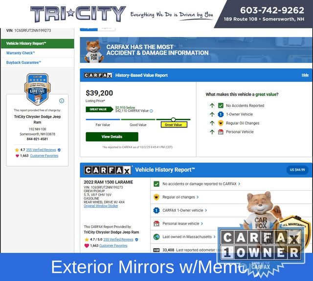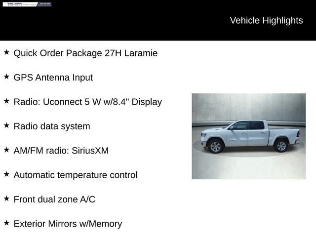 Fully serviced & Ready To Drive Home Today CALL NOW BEFORE ITS GONE!! (603) 207-8583Brakes checkedDrivability/performance checkedExhaust system checkedOil and filter changedDiscover the ultimate driving experience with this exceptional 2022 Ram 1500 Laramie. Boasting a powerful HEMI 5.7L V8 engine, this truck is ready to conquer any terrain with its 4WD capabilities. Indulge in the refined interior, featuring a host of premium amenities that will elevate your daily commute.5.7L V8 HEMI® MDS VVT eTorque Engine $2,295 Customer Value!!(HEMI) (eTorque) (Includes MDS, VVT, Active Noise Control System, Heavy Duty Engine Cooling, HEMI Badge, 23 Gallon Fuel Tank and 18" Aluminum Spare Wheel) (GVWR: 7,100 lbs)• Quick Order Package 27H Laramie• 10 Speakers, AM/FM radio: SiriusXM, GPS Antenna Input, Radio data system, Radio: Uconnect 5 W w/8.4" Display, Automatic temperature control, Front dual zone A/C, Driver Seat Memory, Exterior Mirrors w/Memory, Memory seat, Pedal memory, Power driver seat, Remote keyless entry, Steering wheel mounted audio controls, Brake assist, Electronic Stability Control, ParkView Rear Back-Up Camera, Front fog lights, Fully automatic headlights, Speed control, Heavy-Duty Engine CoolingExperience the ultimate in comfort and convenience with the Laramie's spacious and well-appointed interior. Sink into the luxurious leather-trimmed seats, which offer both heating and ventilation for year-round comfort. The 8.4-inch touchscreen display puts a wealth of connectivity and entertainment features at your fingertips, including Apple CarPlay and Android Auto integration.Designed with your safety in mind, this Ram 1500 Laramie is equipped with a comprehensive suite of advanced driver-assistance technologies. From the ParkView Rear Back-Up Camera to the Electronic Stability Control, you can navigate the roads with confidence, knowing that your vehicle has your back.Under the hood, the HEMI 5.7L V8 engine delivers a thrilling driving experience, with ample power and responsiveness. Paired with an 8-speed automatic transmission, this powertrain ensures smooth and efficient performance, whether you're towing a heavy load or tackling the daily commute.With its striking white exterior and rugged good looks, this Ram 1500 Laramie is sure to turn heads wherever you go. The chrome exterior accents and 18-inch aluminum wheels add a touch of sophistication, while the functional features, such as the rear step bumper and front fog lights, enhance both style and functionality.Don't miss your chance to own this exceptional 2022 Ram 1500 Laramie. Schedule a test drive today and experience the power, comfort, and technology that make this truck a true standout in its class. We're confident that once you get behind the wheel, you'll be convinced that this is the perfect vehicle to take your driving experience to the next level.