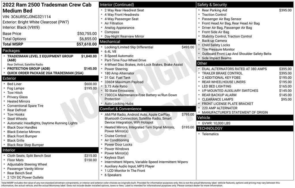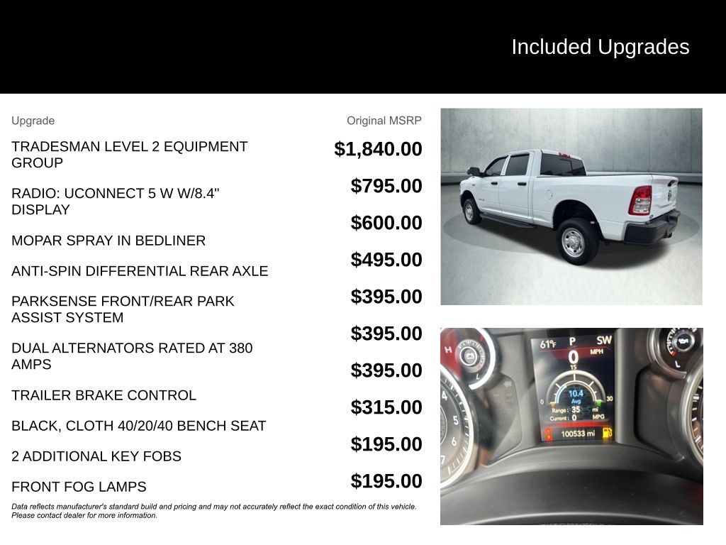 Elevate your driving experience with this exceptional 2022 Ram 2500 Tradesman. Boasting a powerful 6.4L V8 engine and 4-wheel drive, this truck is built to conquer any terrain with ease. Equipped with a wealth of premium features, this Tradesman model offers unparalleled capability and comfort.Highlights of this vehicle include:- MOPAR Spray In Bedliner- Anti-Spin Differential Rear Axle- ParkSense Front/Rear Park Assist System- Dual Alternators Rated at 380 Amps- Trailer Brake Control- LED Bed Lighting- Power Adjust & Heated Black Tow Mirrors- Radio: Uconnect 5 W w/8.4" Display- Apple CarPlay and Google Android Auto- Bluetooth Handsfree Phone & AudioThis Tradesman trim level also comes with the Tradesman Level 2 Equipment Group, which adds features like SiriusXM Satellite Radio, Rear Window Defroster, Rear Power Sliding Window, and more. The Protection Group further enhances the vehicle's capabilities, providing added peace of mind on the road.The attention to detail is evident throughout the interior, with a stylish and practical design that prioritizes both form and function. From the intuitive Uconnect infotainment system to the comfortable cloth seating, this Ram 2500 Tradesman is engineered to make every journey a pleasure.Rugged and reliable, this 2022 Ram 2500 Tradesman is the perfect companion for those who demand the best. With its impressive performance, comprehensive features, and unwavering durability, this truck is ready to tackle any challenge you throw its way.At our dealership, we understand that finding the right vehicle is more than just a transaction – it's a partnership. That's why our team of knowledgeable and friendly sales professionals are dedicated to providing you with an exceptional buying experience, ensuring that you drive away in the perfect truck for your needs.Don't miss your chance to own this exceptional 2022 Ram 2500 Tradesman. Schedule a test drive today and experience the power, capability, and comfort that this remarkable truck has to offer.