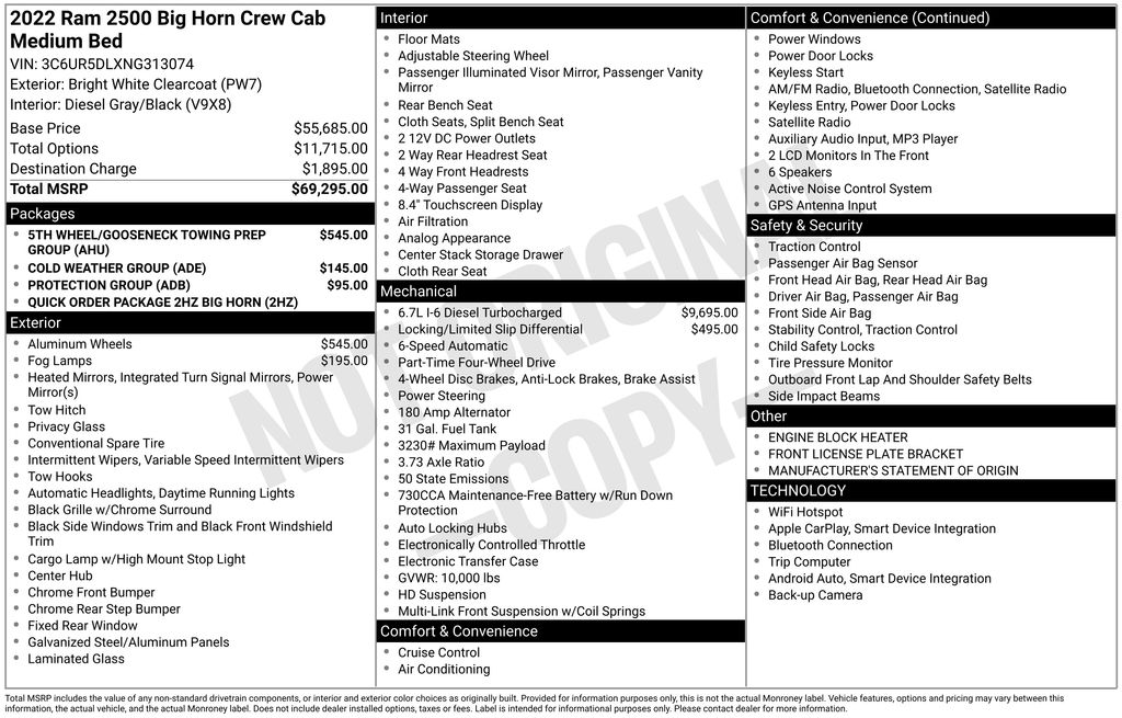 This 2022 Ram 2500 Big Horn is a rugged and capable pickup that's ready to tackle any job or adventure. With its powerful Cummins 6.7L I6 Turbodiesel engine, 4-wheel drive, and impressive towing capacity, this truck is built to handle the toughest tasks with ease.