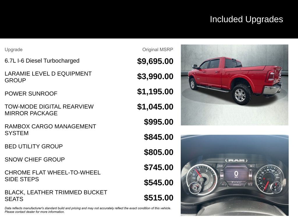 Introducing the 2022 Ram 2500 Laramie - a true workhorse built to conquer any challenge. With its powerful Cummins 6.7L I6 Turbodiesel engine, this heavy-duty pickup delivers uncompromising performance and capability. Imagine the possibilities as you explore its impressive array of advanced features, designed to elevate your driving experience.