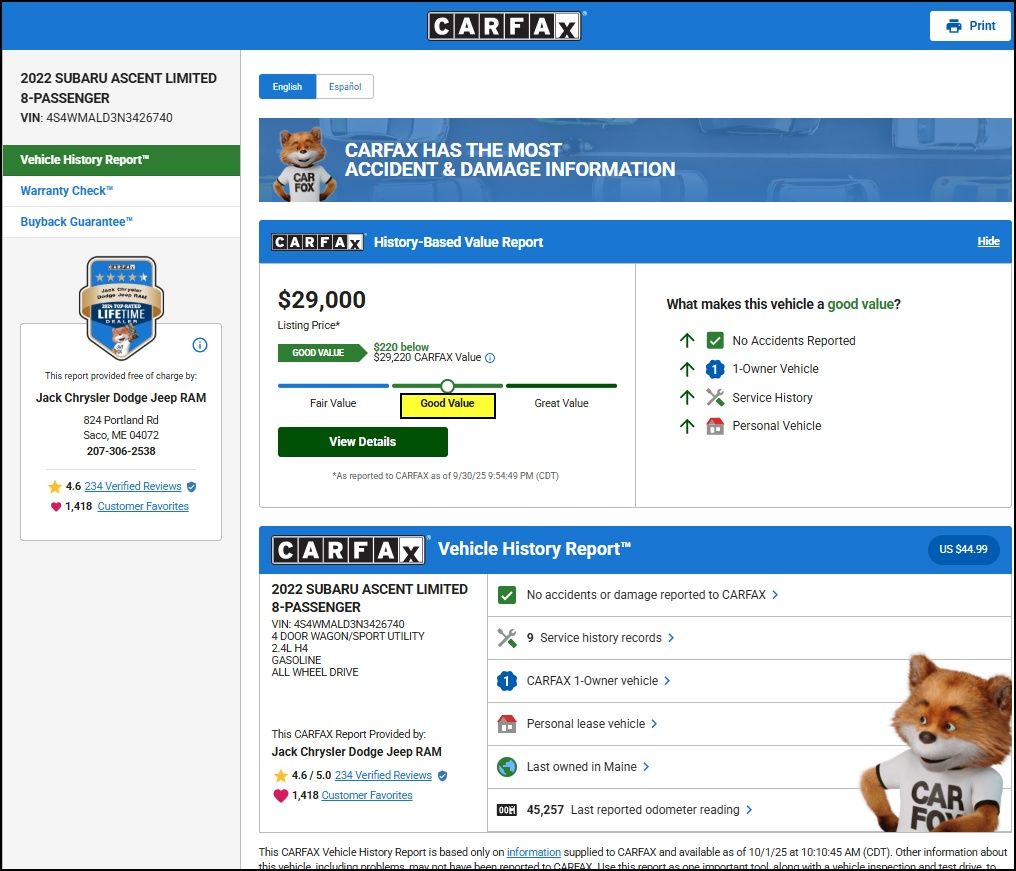 Vehicle Fully serviced & Ready To Drive Home Today !! If you’re looking for A GREAT DEAL & VALUE For Your Money then you just found it!! CALL NOW BEFORE ITS GONE!! 207-282-4101Pre-delivery inspection completedAir filter replacedCabin air filter replaced/cleanedFour tires balancedFour tires mountedFour wheel alignment performedEmissions or safety inspection performedOil and filter changed!Elevate your driving experience with the 2022 Subaru Ascent Limited. This exceptional SUV is more than just a practical choice - it's a testament to Subaru's commitment to quality, safety, and innovation.Boasting a comprehensive suite of features, the Ascent Limited is designed to cater to your every need. Key highlights include:• Dual Glass Panoramic Power MoonroofLeatherTrimmed Seating for 8 Passengers2nd & 3rd Row Seat w/ 60/40 Split FoldDown Rear SeatbackHeated Front Seats, Side Mirrors, Wiper DeIcerHeated Leather Steering Wheel w/ Leather Shift KnobEyeSight DriverAssist System w/ Automatic Emergency BrakingLane Departure Warning, Adaptive Cruise Control w/ Lane Keep AssistReverse Automatic Braking SystemLED Steering Responsive Headlights with High Beam Assist20" Aluminum Alloy Wheels Dark Gray with Machine FinishLED Fog LightsPower Rear Gate w/ Height Memory• Subaru STARLINK 8.0" Multimedia Nav System• harman/kardon Quantum Logic Surround Sound System• Heated Steering Wheel• Perforated Leather-Trimmed Upholstery• Power Liftgate• Automatic Temperature Control• Remote Keyless EntryThe Ascent's striking exterior is complemented by its spacious and versatile interior, offering seating for up to eight passengers. With ample cargo space and a powerful 2.4L 4-cylinder DOHC engine, this SUV is ready to handle your daily commute, family adventures, and everything in between.Safety is paramount in the Ascent, and Subaru has equipped this vehicle with a comprehensive suite of advanced safety features. From Eyesight Driver Assist Technology to Blind Spot Detection and Rear Cross-Traffic Alert, you can drive with confidence, knowing that you and your loved ones are protected.The Ascent's impressive fuel efficiency, with an EPA-estimated 20 city/26 highway MPG, further enhances its appeal. Whether you're navigating city streets or tackling winding country roads, this SUV delivers a smooth and responsive driving experience.At our dealership, we understand that finding the perfect vehicle is a personal journey. That's why we're dedicated to providing you with exceptional customer service and a hassle-free buying experience. Our knowledgeable sales team is here to answer any questions you may have and help you discover why the 2022 Subaru Ascent Limited is the ideal choice for your next adventure.Don't settle for less. Experience the exceptional craftsmanship, advanced technology, and uncompromising safety of the 2022 Subaru Ascent Limited. Visit our showroom today and let us help you find the perfect vehicle to elevate your driving experience.