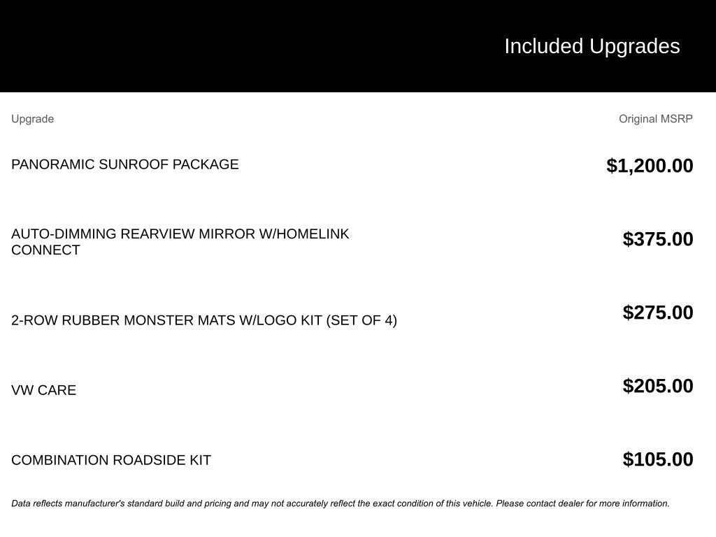 Hill Hold Control & Hill Descent Control- IQ.DRIVE® features:- Travel Assist (semi-automated driving assistance)- Adaptive Cruise Control (ACC) Stop & Go- Lane Assist (Lane Keeping System)- Emergency Assist (semi-automated vehicle assistance in a medical emergency)- Front Assist (Forward Collision Warning & Autonomous Emergency Braking w/ Pedestrian Monitoring)- Active Side Assist (Blind Spot Monitor)- Rear Traffic AlertDiscover the Volkswagen Tiguan - the SUV that combines style, performance, and unparalleled versatility. This 2022 Tiguan 2.0T SE is a true gem, offering a captivating blend of modern design, advanced technology, and a driving experience that will leave you eager to explore the open road.Boasting a sleek White exterior and a well-appointed interior, this Tiguan is ready to take you on unforgettable adventures. Let's take a closer look at the features that make this SUV stand out:• Panoramic Sunroof Package• Auto-Dimming Rearview Mirror with HomeLink Connect• 2-Row Rubber Monster Mats with Logo Kit• VW Care Prepaid Scheduled Maintenance• Combination Roadside KitThis Tiguan is powered by a 2.0L TSI DOHC engine, delivering a remarkable 22 city/29 highway MPG. With an 8-Speed Automatic transmission and All-Wheel Drive, you'll enjoy a smooth, confident ride no matter the terrain.Step inside and you'll be greeted by a spacious and well-appointed cabin, featuring Perforated V-Tex Leatherette Seating Surfaces and Heated Front Comfort Seats. The MIB3 Composition Media infotainment system, with SiriusXM and 360L, keeps you connected and entertained on every journey.Safety is paramount in the Tiguan, with features like Dual Front Impact Airbags, Dual Front Side Impact Airbags, and Electronic Stability Control providing you and your loved ones with the protection you deserve.But the Tiguan is more than just a practical SUV - it's a statement of style and sophistication. The Exterior Parking Camera Rear, Power Liftgate, and 18-inch Dark Graphite 10-Spoke Alloy Wheels add a touch of elegance and convenience to your daily drives.As you can see, this 2022 Volkswagen Tiguan 2.0T SE is a remarkable vehicle, packed with features that will elevate your driving experience. With a list price of $24,200, it's an exceptional value that you won't want to miss.Don't let this opportunity slip away. Come in and experience the Tiguan for yourself. We're confident that once you take it for a test drive, you'll be eager to make it your own. Visit us today and let's discuss how we can get you behind the wheel of this stunning SUV.