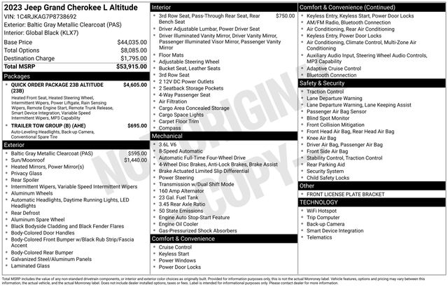 Versatility is the hallmark of the 2023 Jeep Grand Cherokee L Altitude. With the available Power Liftgate and 7-Passenger Seating, you can easily accommodate your passengers and cargo, making it the perfect companion for your adventures. The Trailer Tow Group (B) further enhances its capabilities, allowing you to tow with confidence.