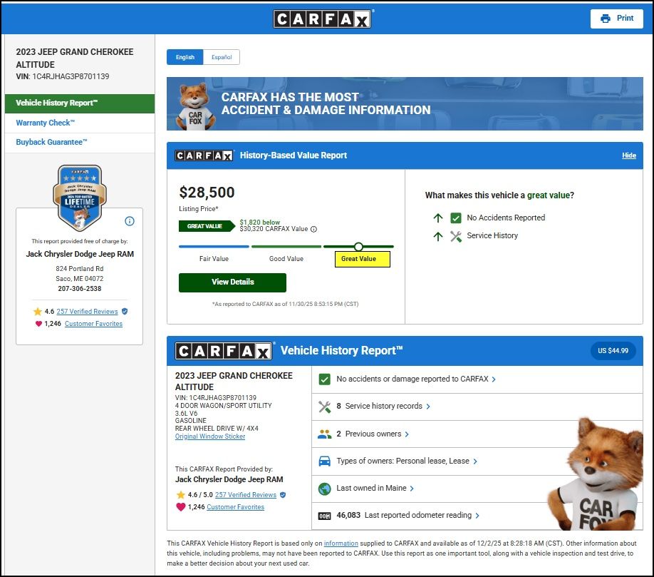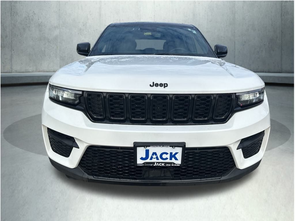 2023 Jeep Grand Cherokee Altitude 4WD, 115-Volt Auxiliary Power Outlet, Altitude Appearance Package, Altitude Package, Automatic temperature control, Black Headliner, Brake assist, Delay-off headlights, Dual front side impact airbags, Electronic Stability Control, Front dual zone A/C, Fully automatic headlights, Heated door mirrors, Illuminated entry, Knee airbag, Leather-Faced Bucket Seats (DISC), Panic alarm, ParkView Rear Back-Up Camera, Power door mirrors, Power driver seat, Power Liftgate, Power Sunroof, Quick Order Package 22B Altitude (DISC), Rain-Sensing Windshield Wipers, Remote Start System, Security system, Selectable Tire Fill Alert, Speed control, Speed-Sensitive Wipers, Split folding rear seat, Wheels: 20" x 8.0" Gloss Black Aluminum, Wireless Charging Pad. 19/26 City/Highway MPG Clean CARFAX.